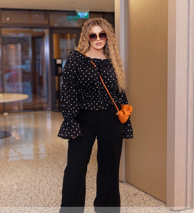 Рукава блузи доповнені гумкою, що додає стильний акцент та створює ефектний волан на зап'ястях. Талія виділена широкою гумкою, що створює красивий ефект та робить силует більш підтягнутим. Блуза також доповнена воланом знизу, що доповнює композицію. Брюки з кишенями з боків доповнюють цей костюм своєю лаконічністю, створюючи елегантний, але такий простий водночас образ.