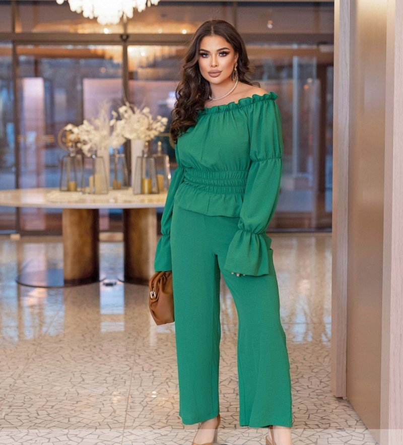 Неймовірний костюм, який підкорив наше серденько та впевнені, що зачарує й Вас. Складається він з блузи із довгим рукавом та базових брюк широкого крою. Розкішна блуза з горловиною, яка виготовлена в формі човника з гумкою, яка створює невеликі волани, що додають виробу легкості та жіночності.