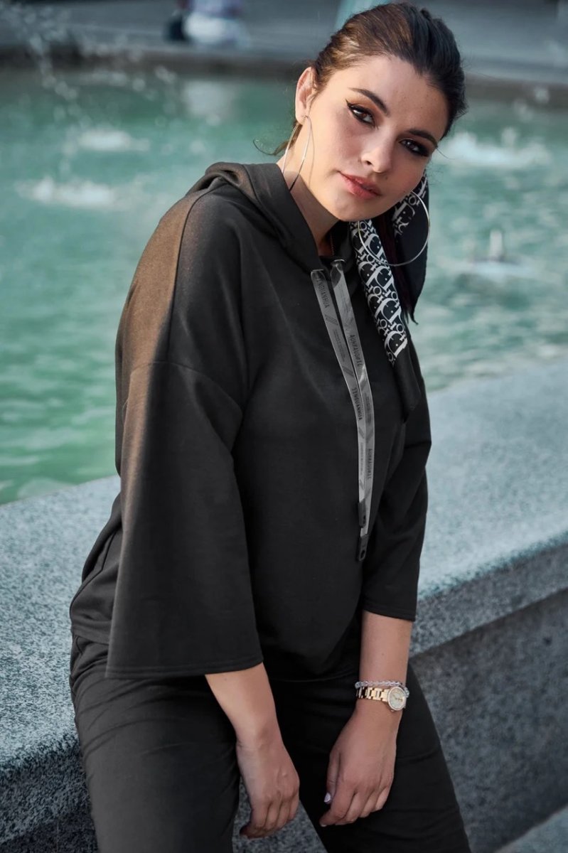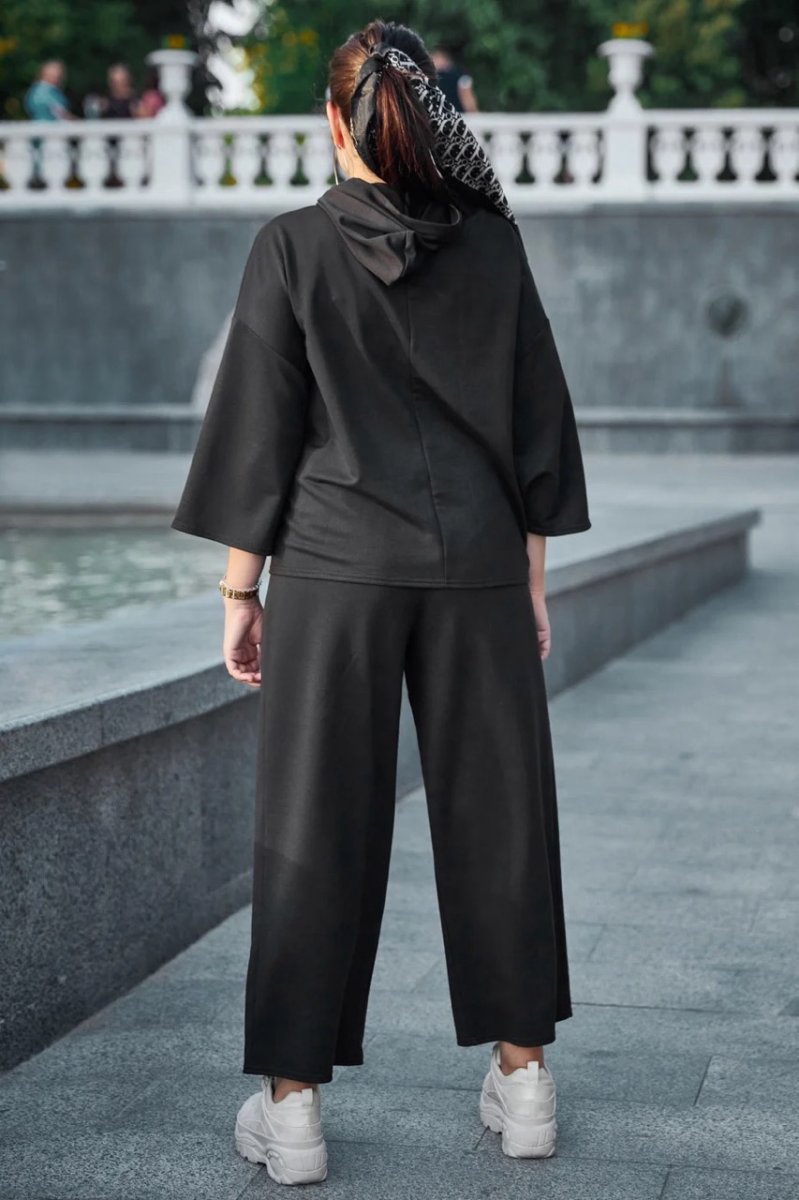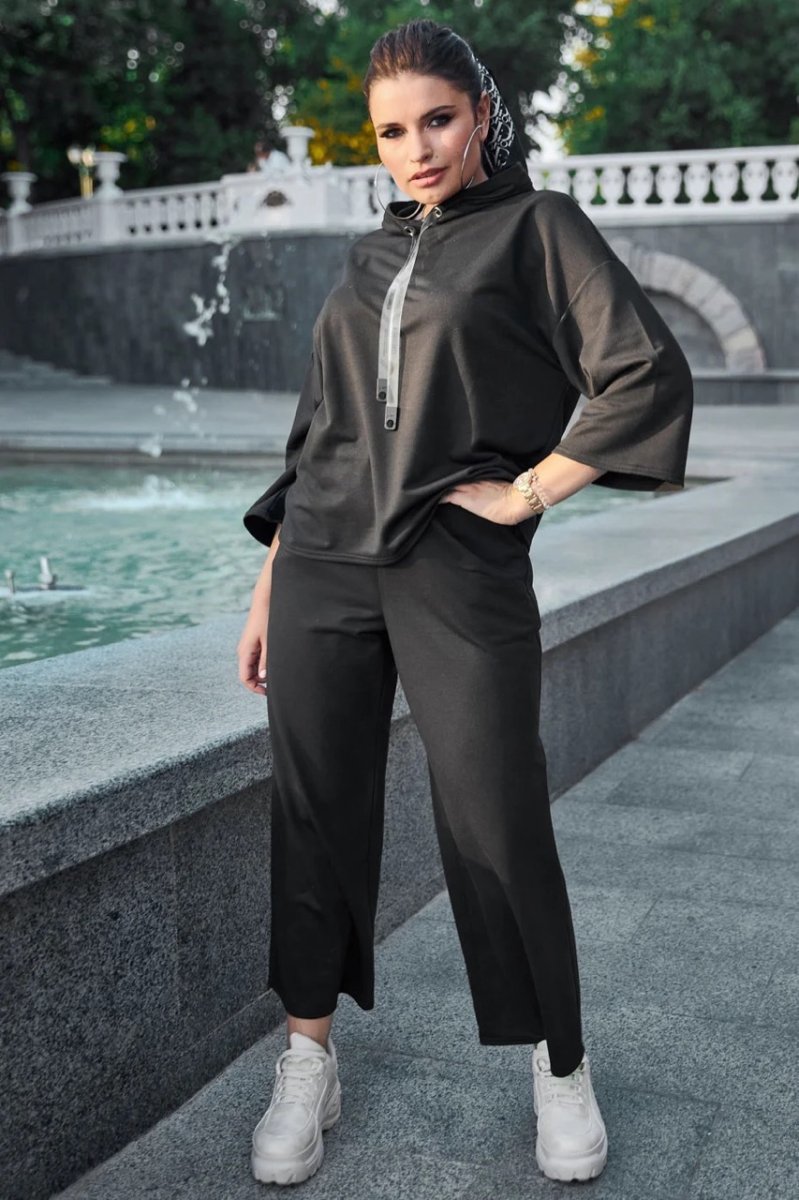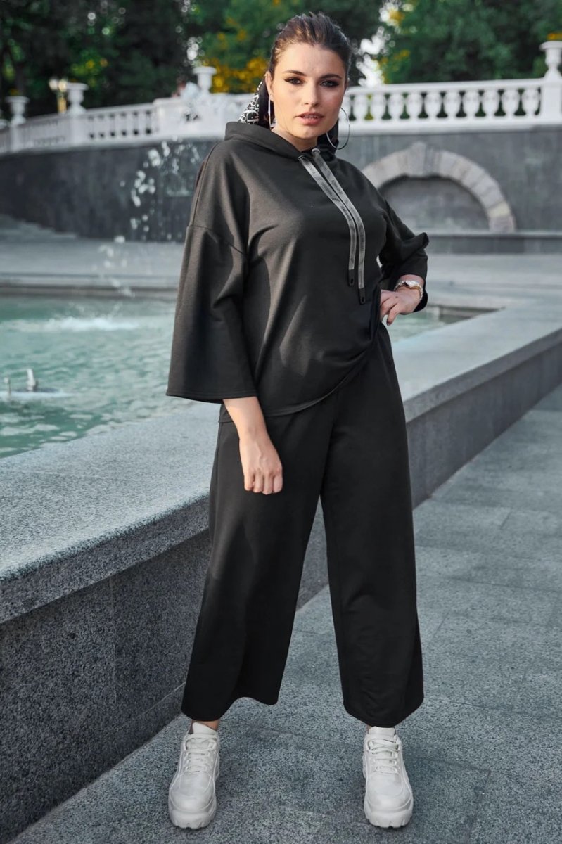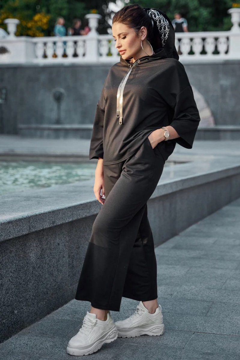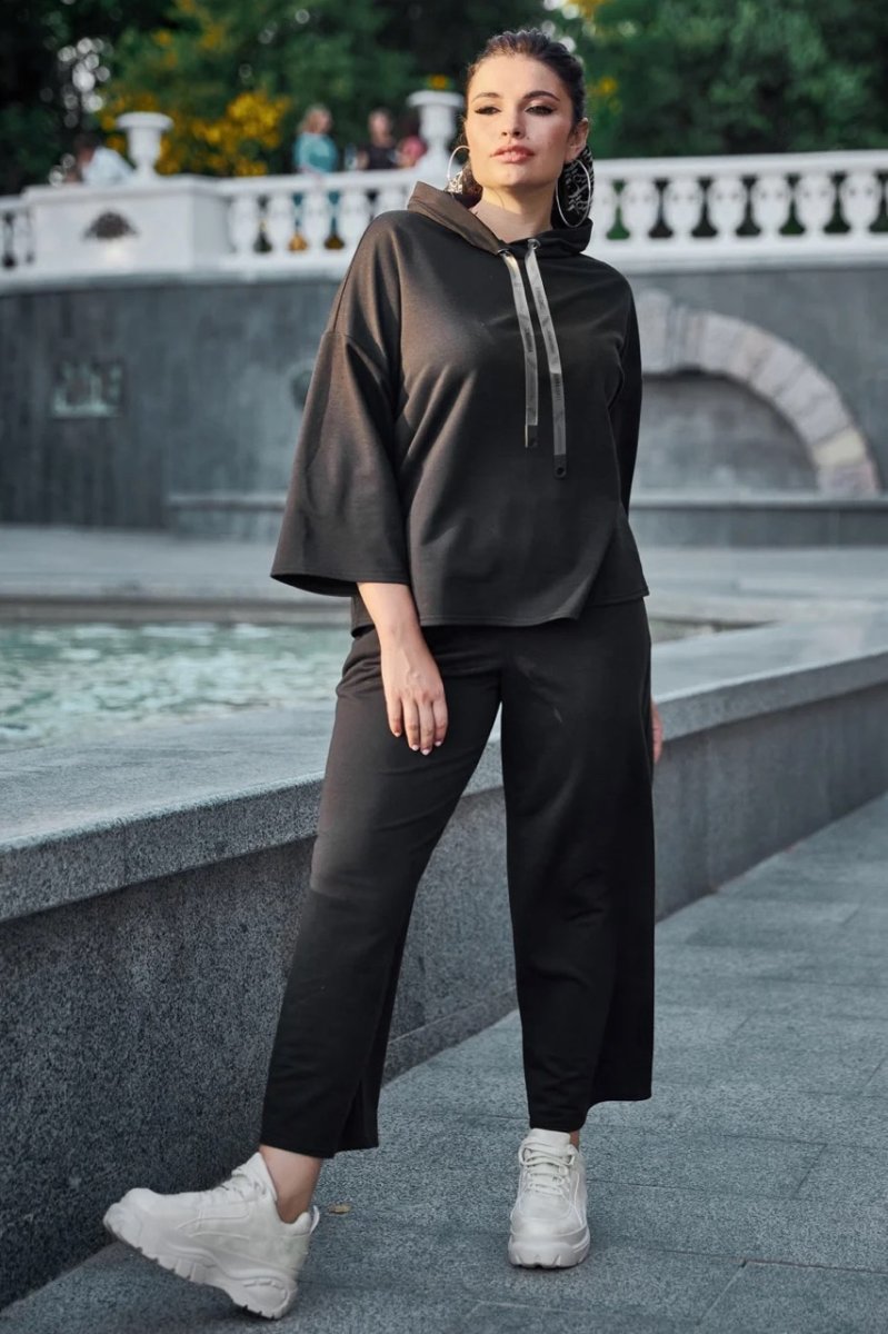Колекція Goodbye summer plus size представляє костюм вільного крою для молодіжного спортивного чи повсякденного образу. Він складається з широких штанів із завищеною талією та кофти з капюшоном прямого фасону. Горловину доповнюють шнурки та хольнітени. Особливу особливість образу забезпечують рукава-дзвін із довжиною три чверті.