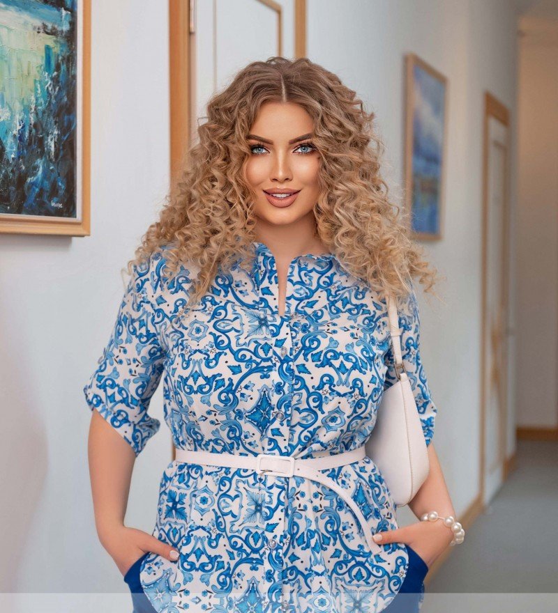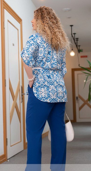 Цей костюм двійка- відмінний вибір для тих, хто любить виразний та стильний одяг. Оригінальний принт блузи з яскравими кольорами відмінно поєднується з базовими брюками, створюючи динамічний й елегантний образ. Подовжена сорочка з довжиною до середини стегон забезпечує зручність та свободу рухів, а пояс, який входить в комплект можна використовувати для підкреслення талії й створення більш приталеного силуету. Бокова частина блузи заокруглена та вкорочена, надаючи їй ще більше оригінальності. Рукава довжини 3/4 з функціональною шльовкою можна регулювати за необхідності. Базові брюки з гумкою на талії та бічними кишенями завершують цей чудовий ансамбль.