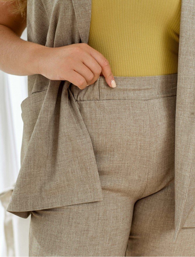 Брючний костюм з подовженим жилетом, який вирізняється лаконічністю та привабливим дизайном. Такий костюм зараз використовують не тільки для класичних образів, а також створюються яскраві жіночні образи для прогулянок. Жилет з воротником та двома накладними кишенями на рівні талії. На грудях є імітація кишені, а застібається виріб на два функціональні ґудзики. Для створення витонченого силуету ми зробили дві вертикальні виточки від кишень. Брюки класичного крою з гумкою на талії та бічними кишенями.