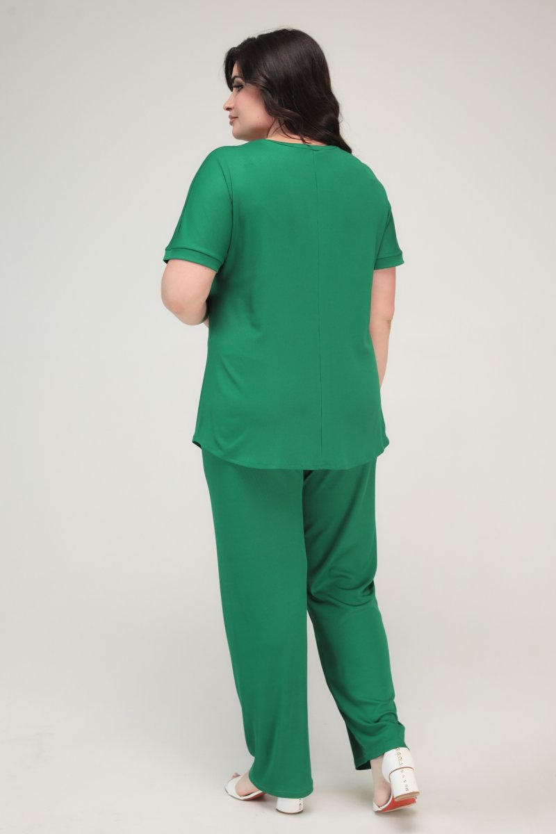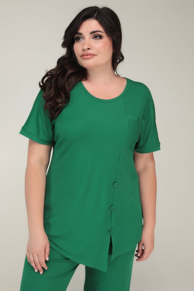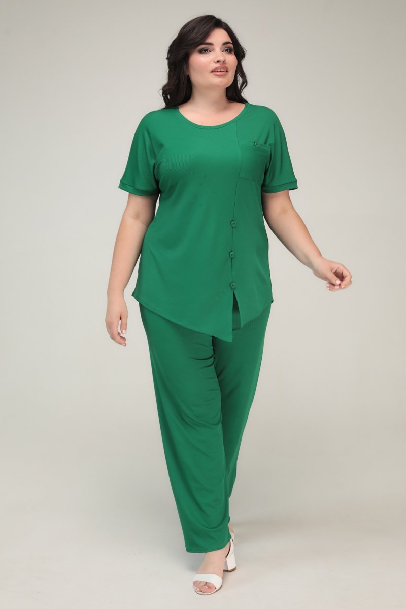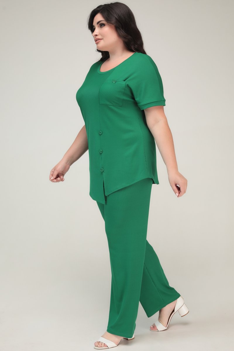 Костюм двопредметний із тканини трикотаж рубчик. Тканина літня, має рефлену, чітко виражену структуру. Матеріал еластичний, гарно лягає по фігурі. Брюки прямі на резинці. Футболка прямого силуету, рукав цільнокроєний на манжеті. Полиця асиметрична з вертикальним швом і знизу з розрізом. По центру виконано горизонтальну краплю, зліва на грудях - накладна кишеня. Ґудзики по всьому виробу – декоративні.