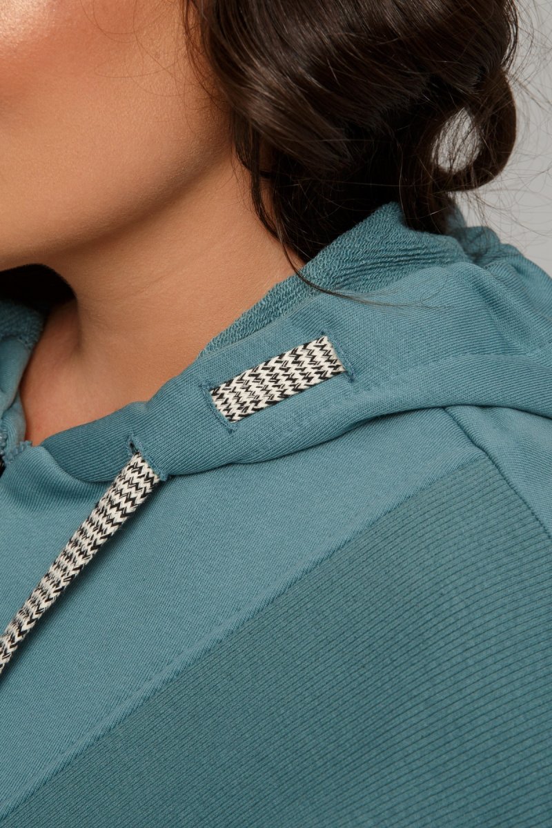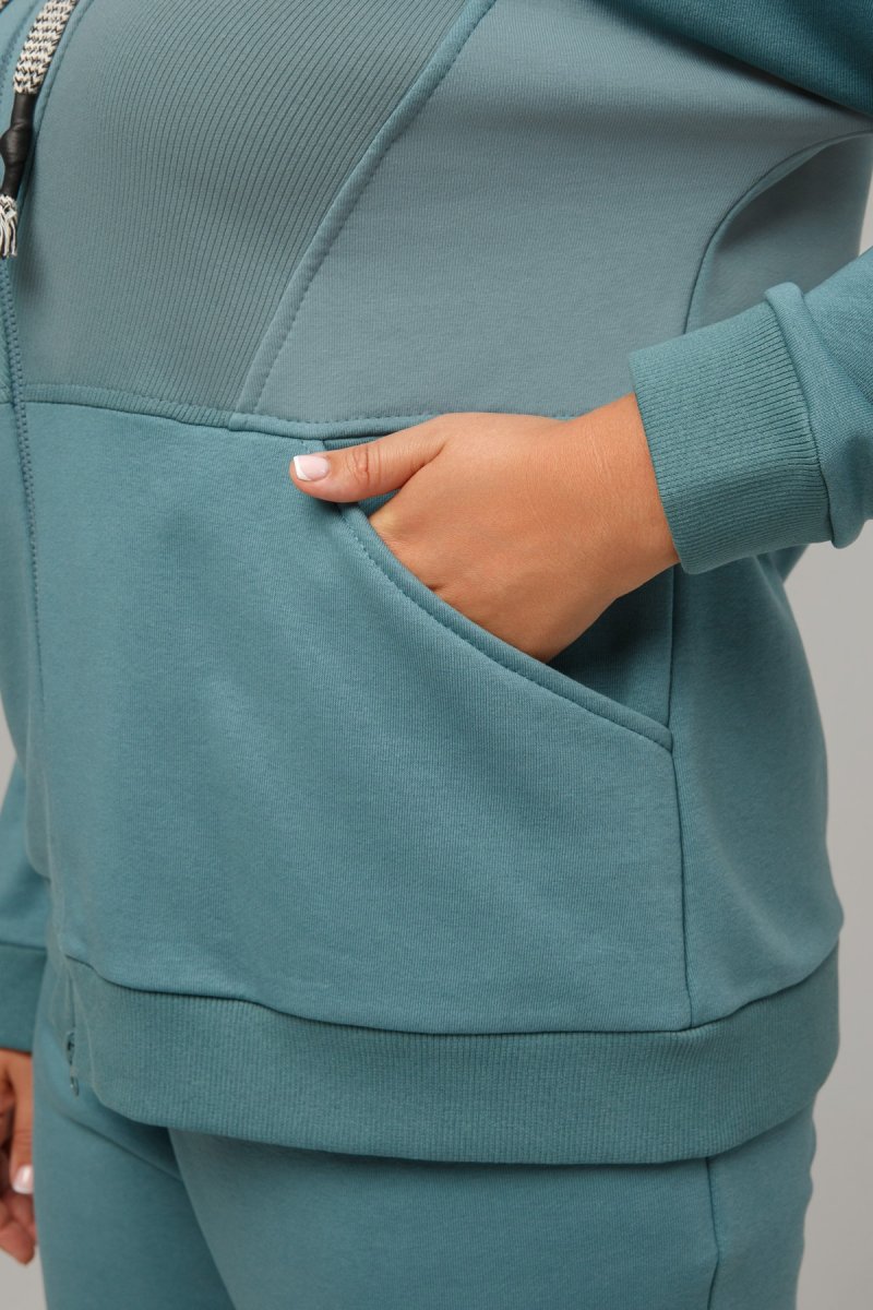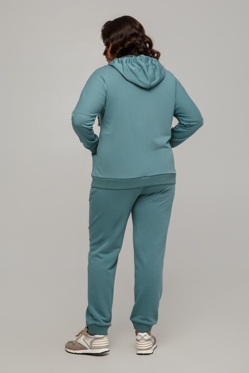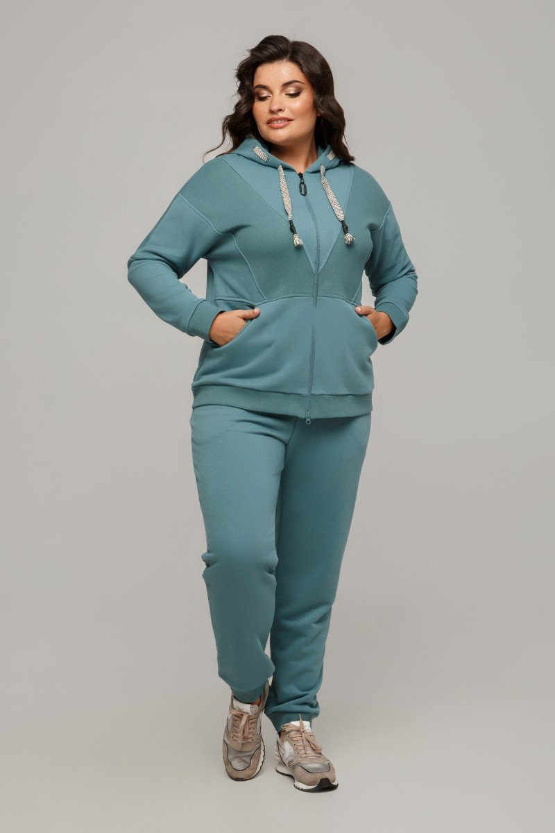 Комплект жіночий двопредметний, що складається з вітровки та штанів. Виконаний із трикотажного полотна - тринитка пеньє петля, без начосу (Туреччина). З обличчя тканина виглядає тонкою гладкою, в'язкою, з вивороту - рифлена фактура у вигляді дрібних повітряних петель, щільність - висока. Розтяжність тканини – середня. Висота капюшону регулюється за допомогою шнурка. Рукав втачний, одношовний, на манжеті. Попереду застібка на «блискавку». Штани прямого силуету на манжеті, спереду – кишені. Вставка по полиці, манжети штанів та вітровки виконані з рібани.
