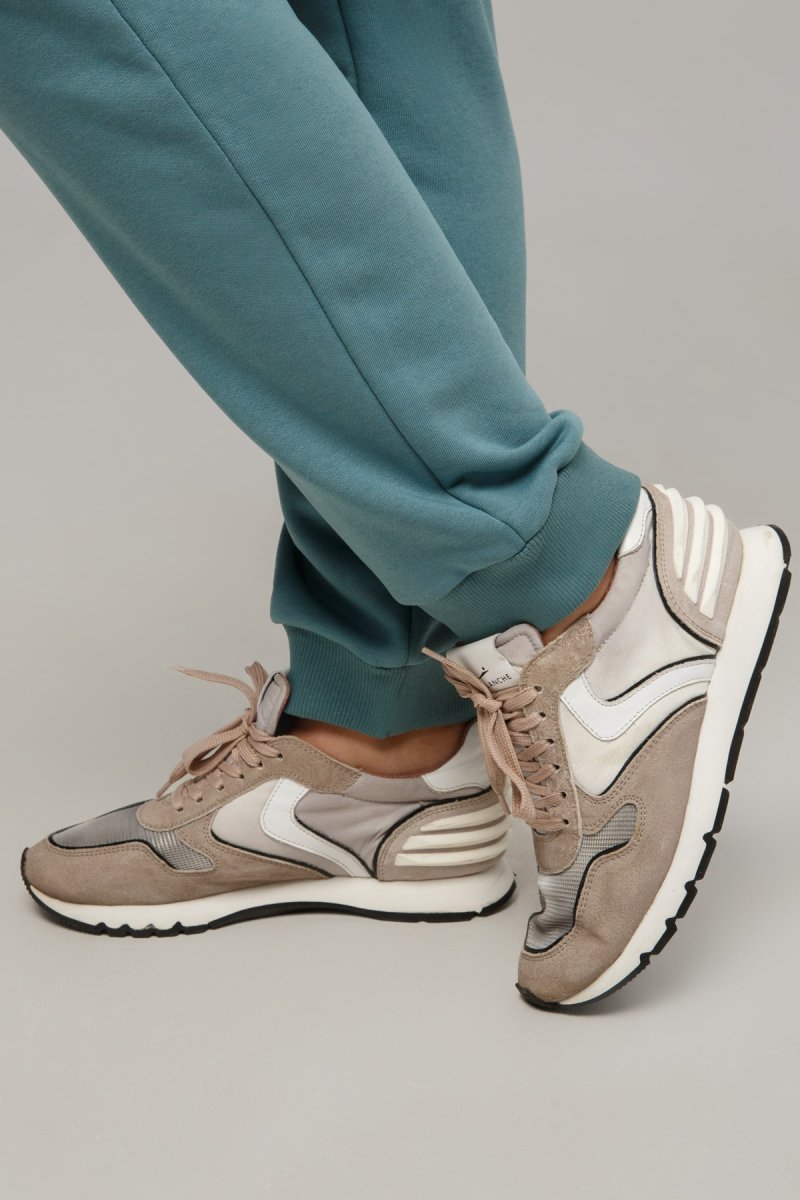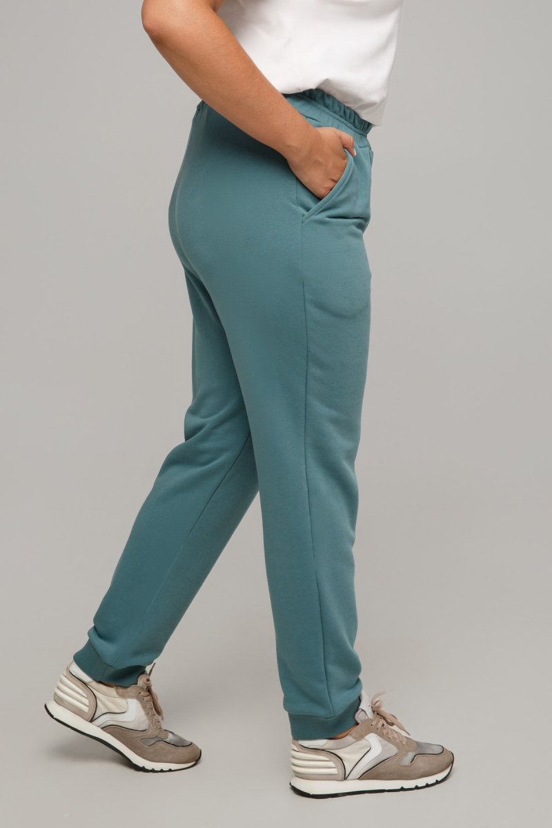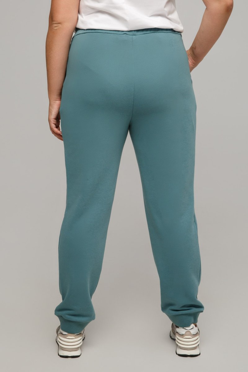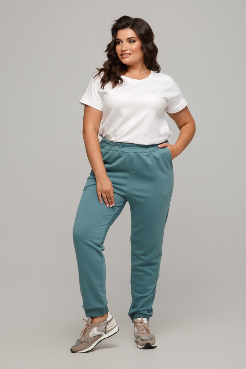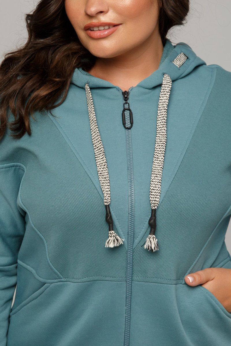 Комплект жіночий двопредметний, що складається з вітровки та штанів. Виконаний із трикотажного полотна - тринитка пеньє петля, без начосу (Туреччина). З обличчя тканина виглядає тонкою гладкою, в'язкою, з вивороту - рифлена фактура у вигляді дрібних повітряних петель, щільність - висока. Розтяжність тканини – середня. Висота капюшону регулюється за допомогою шнурка. Рукав втачний, одношовний, на манжеті. Попереду застібка на «блискавку». Штани прямого силуету на манжеті, спереду – кишені. Вставка по полиці, манжети штанів та вітровки виконані з рібани.