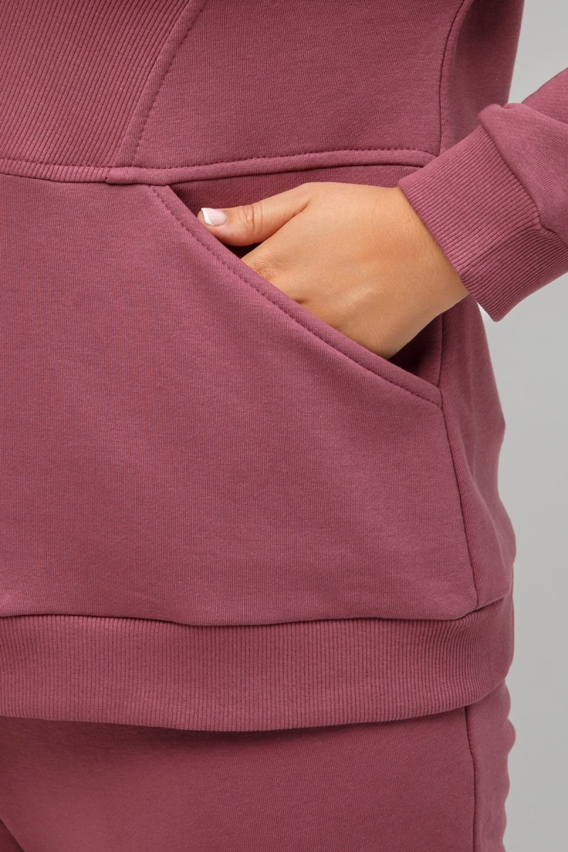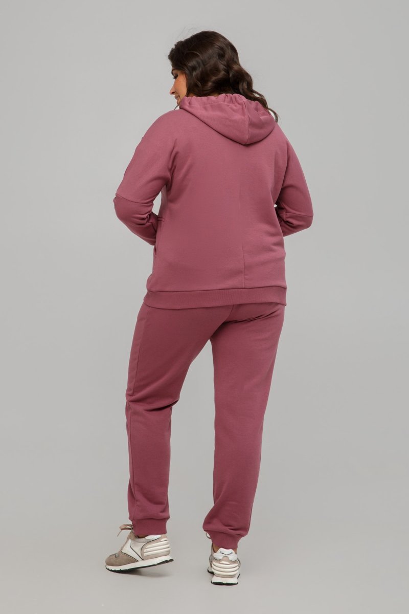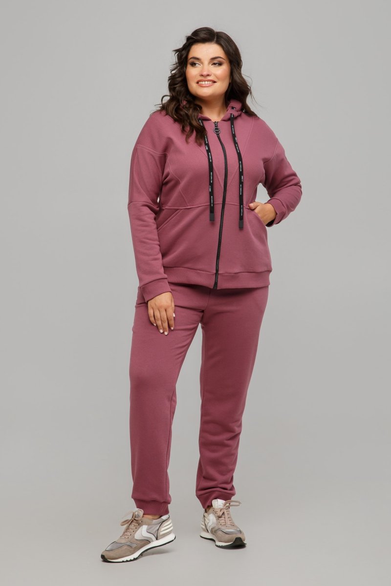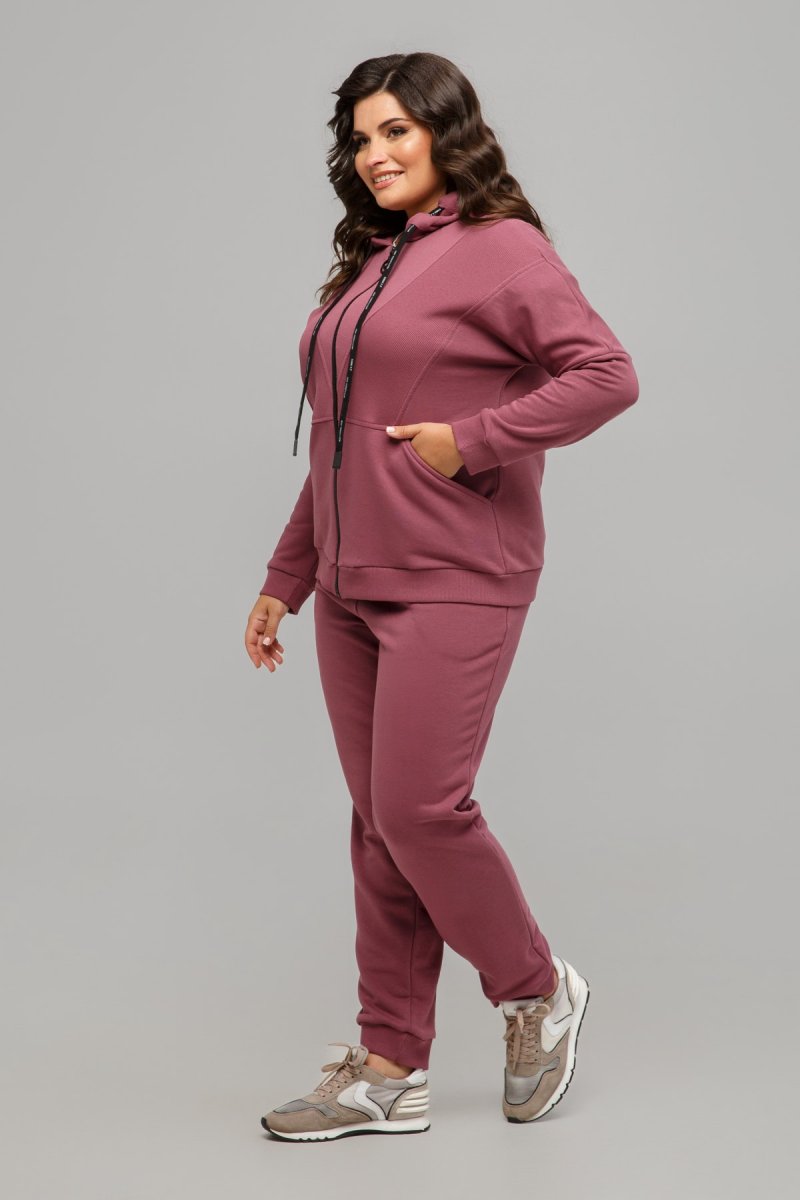 Комплект жіночий двопредметний, що складається з вітровки та штанів. Виконаний із трикотажного полотна - тринитка пеньє петля, без начосу (Туреччина). З обличчя тканина виглядає тонкою гладкою, в'язкою, з вивороту - рифлена фактура у вигляді дрібних повітряних петель, щільність - висока. Розтяжність тканини – середня. Висота капюшону регулюється за допомогою шнурка. Рукав втачний, одношовний, на манжеті. Попереду застібка на «блискавку». Штани прямого силуету на манжеті, спереду – кишені. Вставка по полиці, манжети штанів та вітровки виконані з рібани.