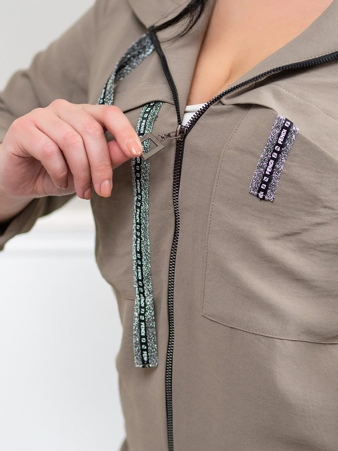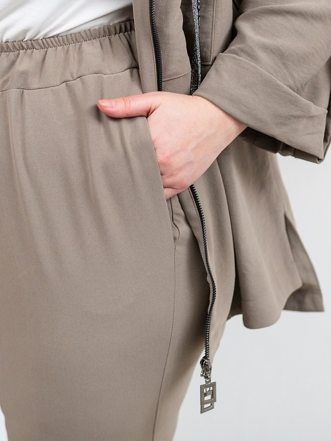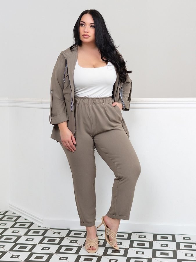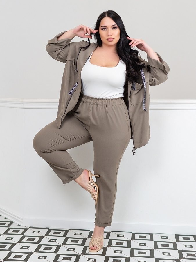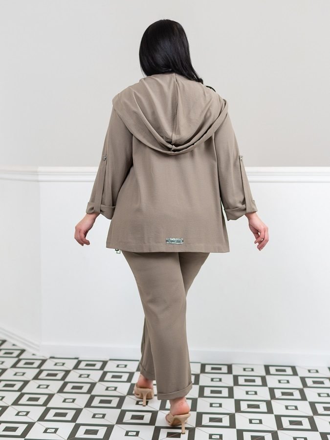 Легкий брючний костюм Модерн складається з кофти і брюк. Кофта вільного крою з капюшоном, рукав з відворотом фіксується на шлевку гудзиком. Застібається на блискавку. На грудях прорізні кишені, приховані під смугою тканини. З боків розрізи, спинка незначно подовжена. Капюшон доповнений зав'язками з сріблястою тасьми, яка також використана в якості оформлення кофти.