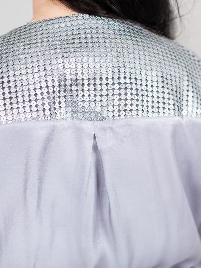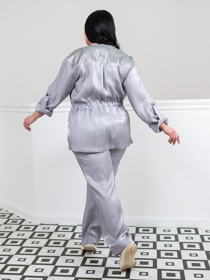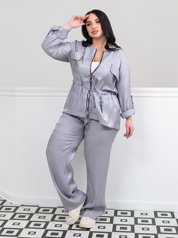 Ефектний брючний костюм з легкої тканини з незначним блиском. Модель складається з кофти вільного крою і просторих штанів. Кофта застібається на металеву блискавку. По лінії талії проходить куліса. Дві нагрудні кишені з клапанами, декоровані паєтками. Довжина рукава регулюється за допомогою шлевки на гудзик. Доповнює виріб знімний декоративний елемент.