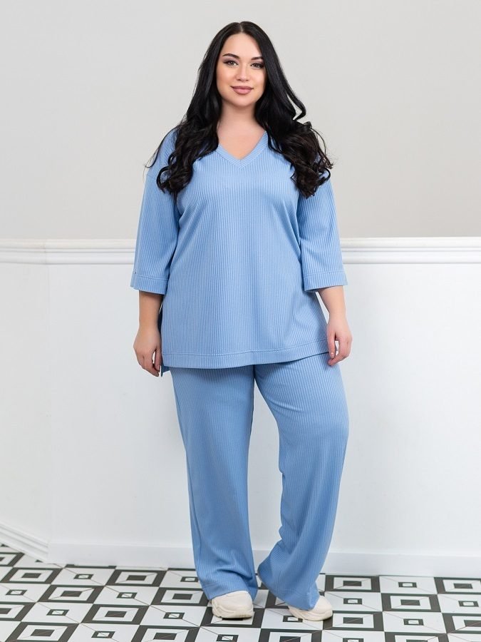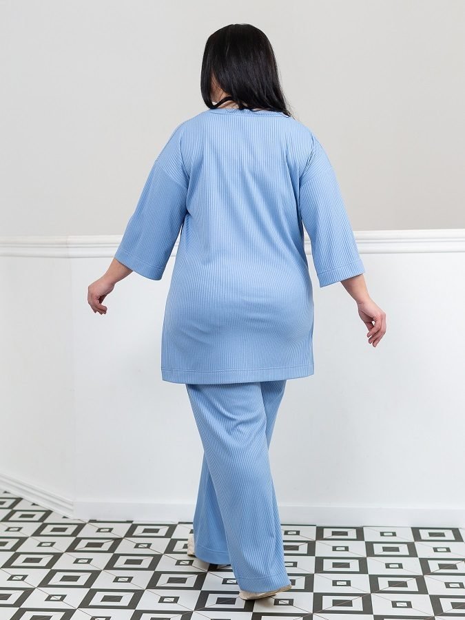 Легкий брючний костюм вільного крою. Кофта з V-подібним вирізом горловини і подовженою на 5 см спинкою, з боків розрізи. Рукав оформлений пришивним декоративним елементом з найменуванням бренду. Штани-палаццо з притачним еластичним поясом і косими кишенями з боків.