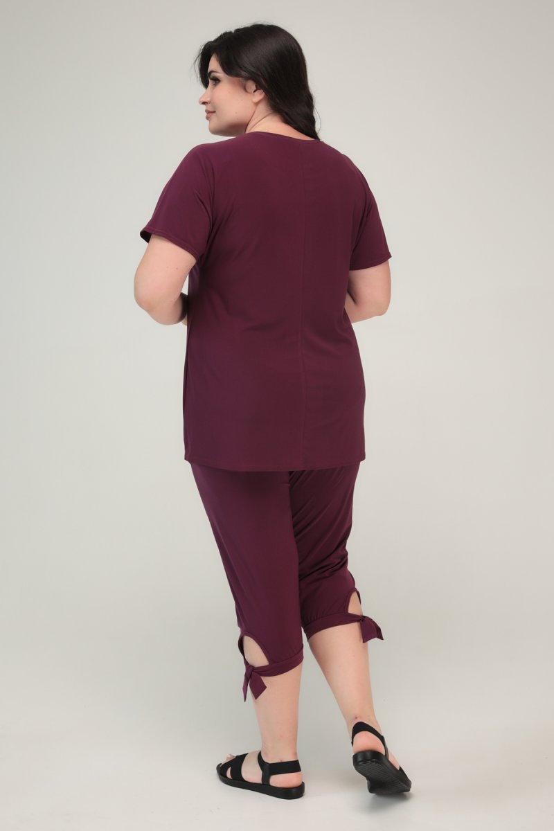 Костюм двопредметний, капрі та футболка, виконаний з якісного матеріалу - трикотаж масло (Південна Корея). Тканина має гладку текстуру, міцна, зносостійка, еластична, красиво облягає фігуру і має відмінну повітряно-пропускну здатність. Не деформується після прання та не піддається утворенню катишок. Капрі прямого силуету, внизу на манжеті із зав'язками. Футболка прямого силуету, рукав цільнокроєний. Полиця асиметрична, знизу по діагональному шву виконаний розріз. По центру полички, у шві, виконано горизонтальну краплю. Низ виробу асиметричний, у правому бічному шві - розріз.