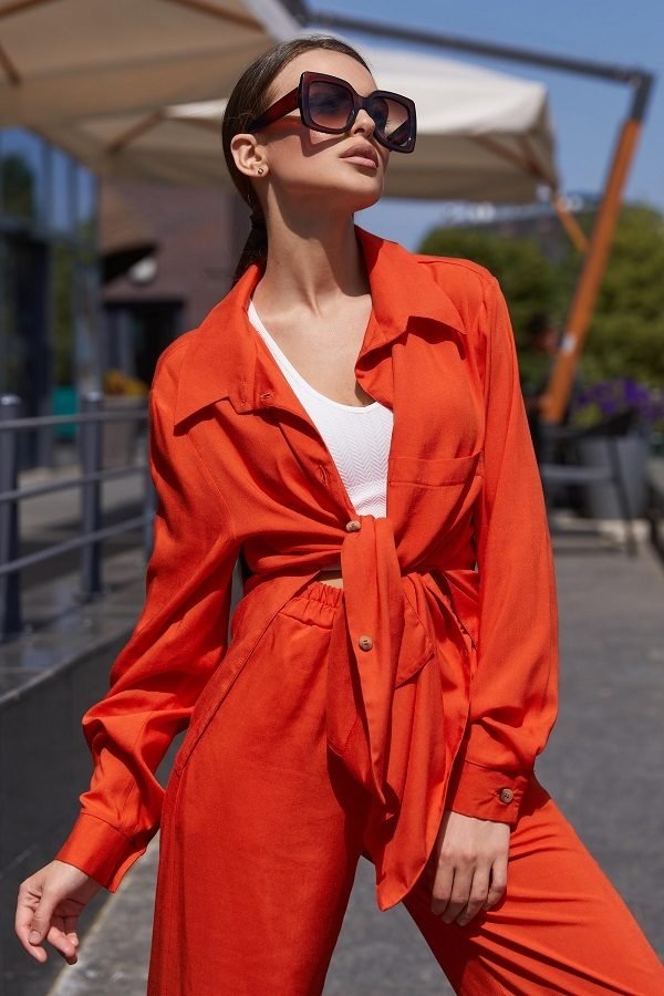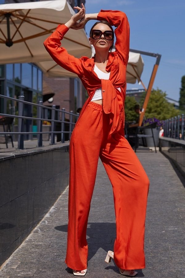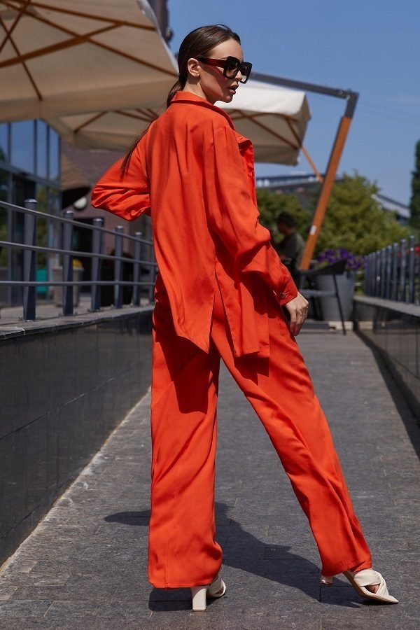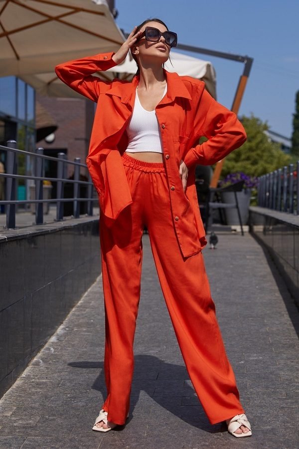 Вільний костюм прямого крою з сорочкою oversize стане вірним супутником в літню спеку. Виріб представлений в яскравих відтінках зеленого, оранжевого, малинового. Така моделька буде вдало і гармонійно виглядати зі спортивним взуттям, а також з високою танкеткою або каблуком. У бічних швах передбачені кишені, вони надають моделі Зручності у використанні. Такий костюм дуже модно поєднувати з коротким топом.