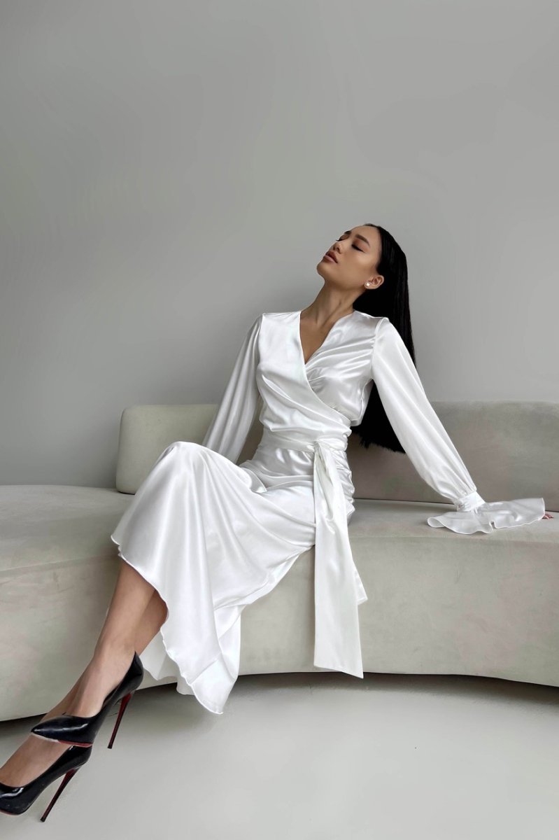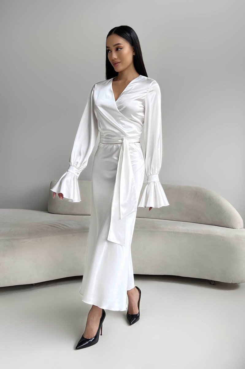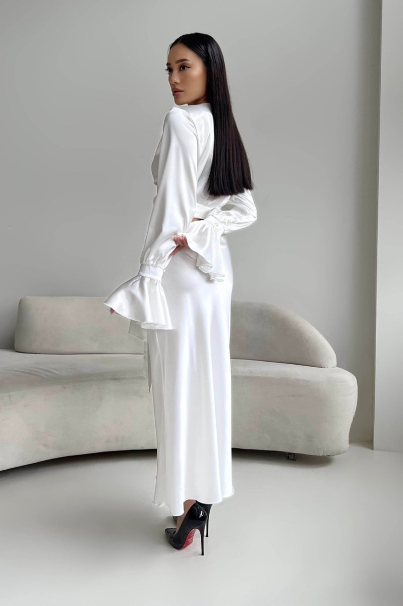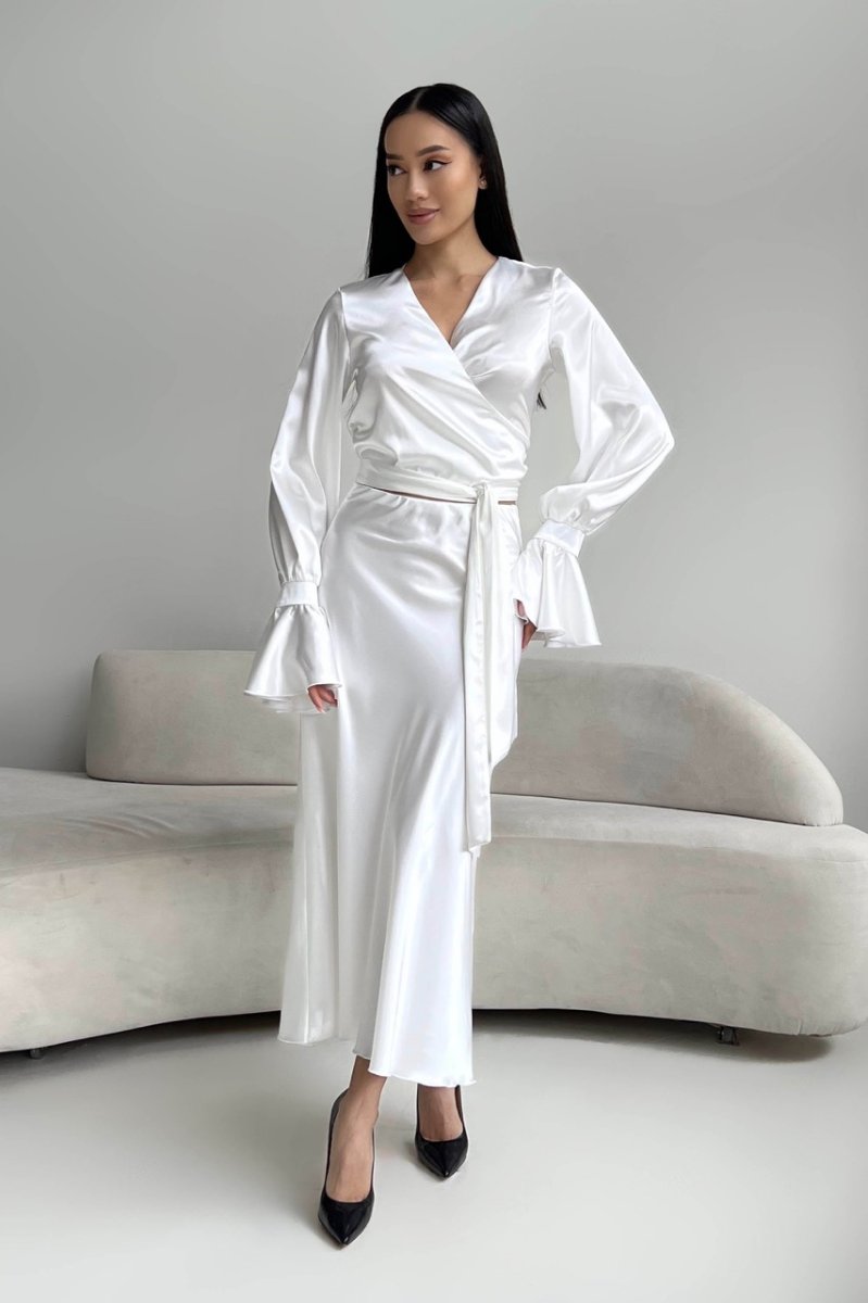 Спідниця – міді з резинкою по талії вільного крою та блуза на запАх з довгим поясом. На рукавах манжети з воланами.