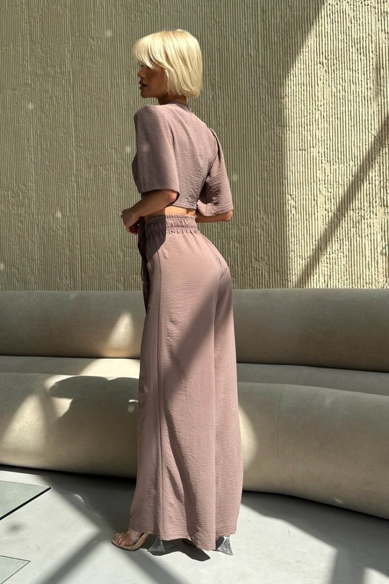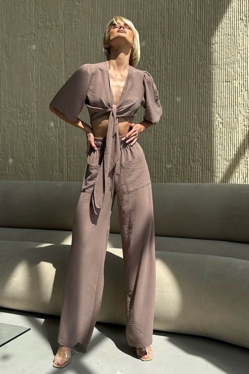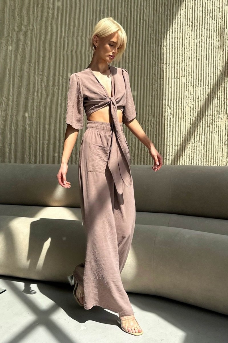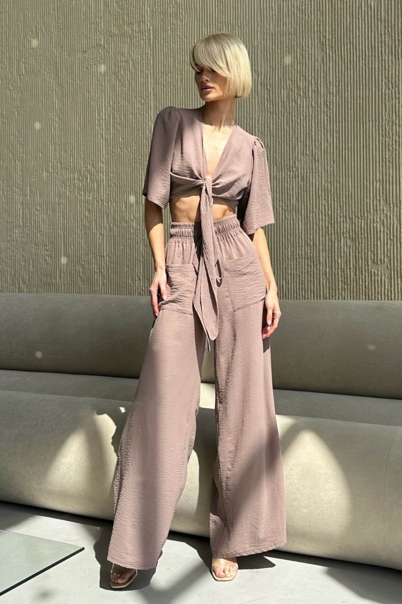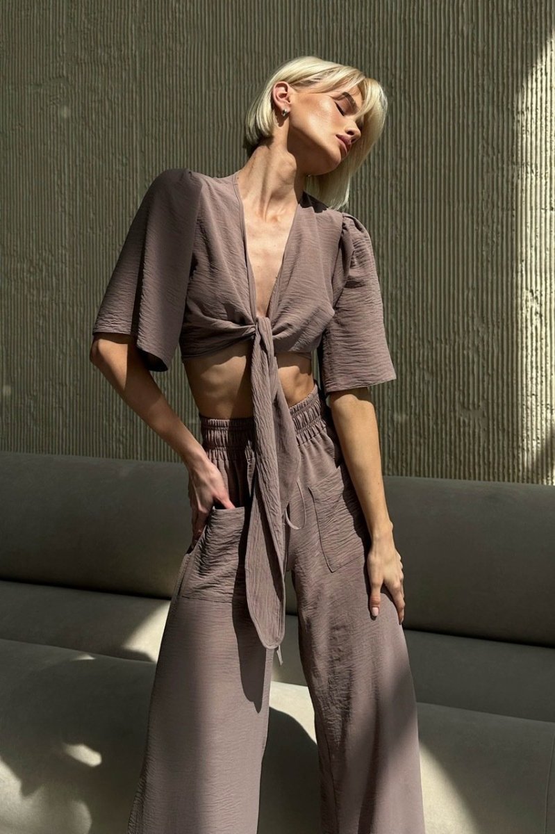 Практичний костюм із топом на зав'язках та глибоким декольте задає настрій усьому образу. Костюм виконано з легкого американського крепу. Топ із коротким рукавами. Штани вільного крою із еластичною вставкою на талії.