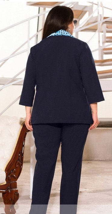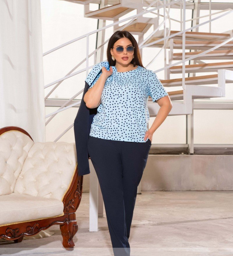 Широкий виріз V-форми підкреслює красу відкритої шиї, а широкі рукави довжини 7/8 додають елегантності цьому образу. Крім того, у комплекті є чарівна блуза в горошок з короткими рукавами, яка гармонійно поєднується з шарфиком на піджаку, зверніть увагу, що розмір принту може змінюватись в залежності від партії. А завершенням цього чудового комплекту є класичні брюки в тон піджака з гумкою на талії та бічними кишенями.