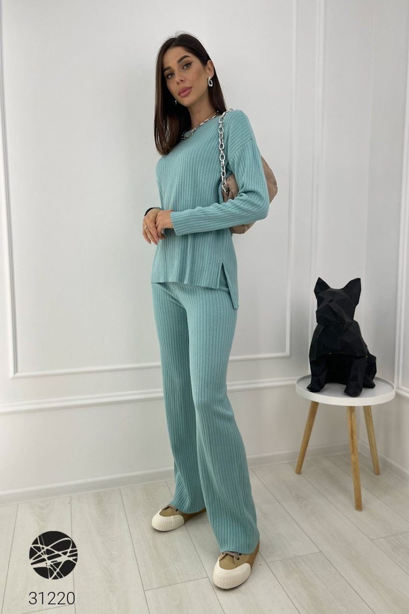 Костюм з якісного трикотажу, виробництва Туреччини. Джемпер з круглим вирізом, занижена лінія плечей, асиметричний нижній край з бічними розрізами. Штани-палаццо із завищеною талією, пояс на гумці. Склад тканини: 50% - віскоза, 50% - акрил.