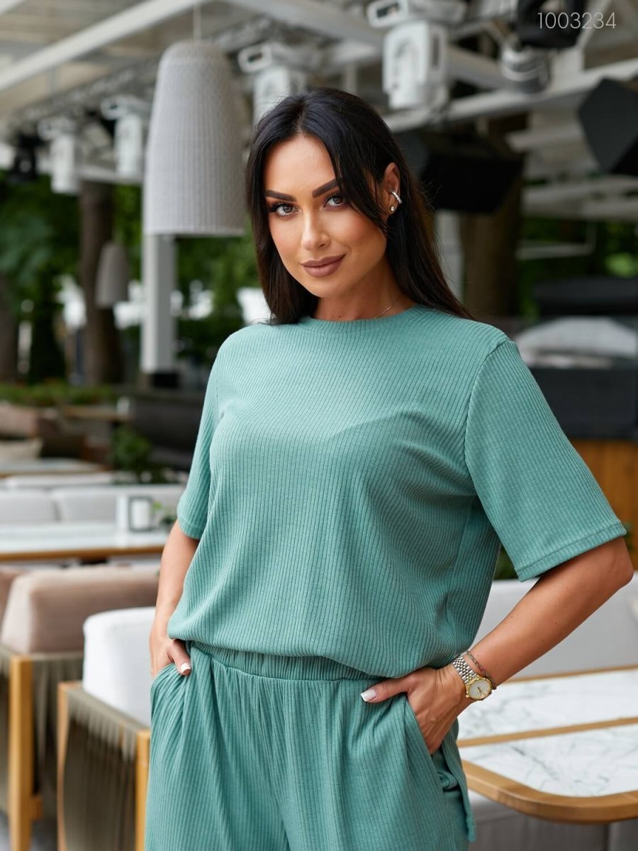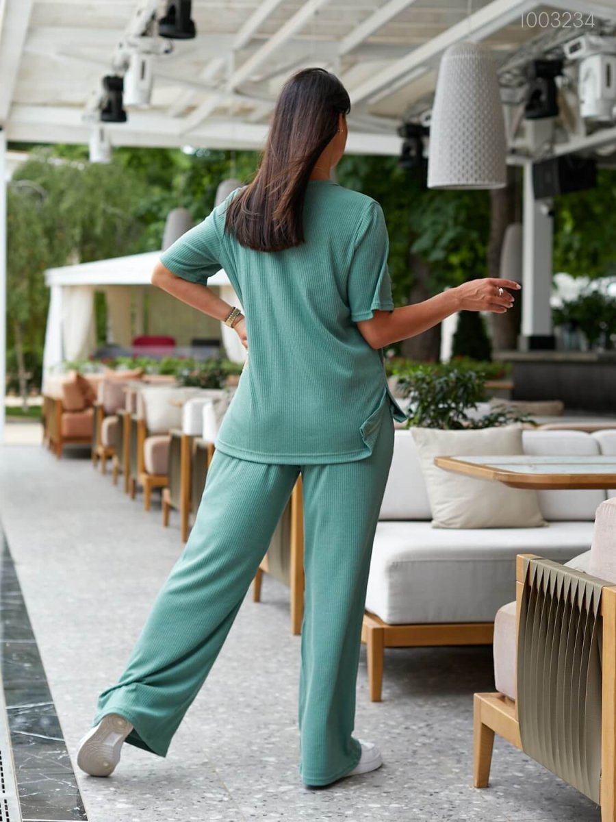 Подробиці: довга футболка вільного крою з округлою горловиною та рукавом до ліктя. Штани-палаццо на широкій гумці, з глибокими кишенями.