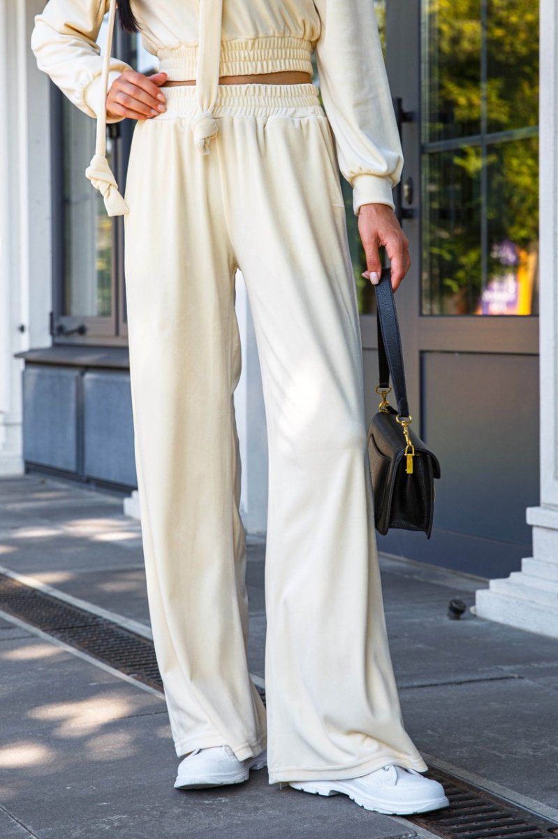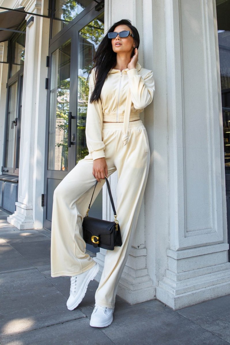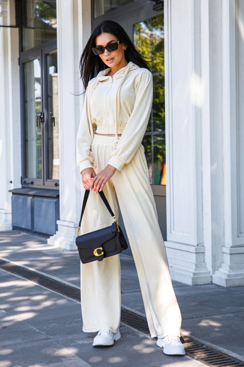 Модний жіночий костюм з велюру у стилі спорт-шик. Наш новий прогулянковий костюм – двійка – чудовий вибір на теплу осінь! Головним критерієм для повсякденного одягу залишається комфорт. У нашій новій моделі Ви почуватиметеся зручно та комфортно, адже це так важливо у сучасному ритмі життя. Модель костюма поєднує у собі світшот з довгими рукавами з капюшоном та штани – кюлоти вільного крою.