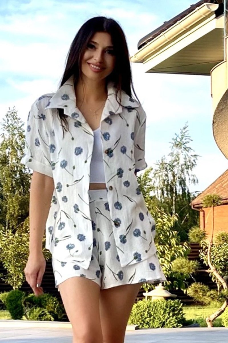 Наша новинка - це універсальне рішення як для походу на пляж, так і для звичайної прогулянки літнього вечора, він представлений у вигляді блузи і шортиків. Блуза прямого крою з центральною планкою на ґудзиках та коротким рукавом з манжетою. Короткі шортики трапецеподібної форми з з легким кльошем, які дозволять продемонструвати стрункі бездоганні ніжки. Пояс на резинці (сзаду) допоможе скоригувати лінію талії і відмінно підійде для будь-якого типу фігури як для худеньких так і для дівчат з апетитними формами. Кишені на шортах до дадуть практичності у використанні. Будь цього літа легкою та досконалою!