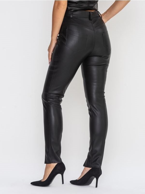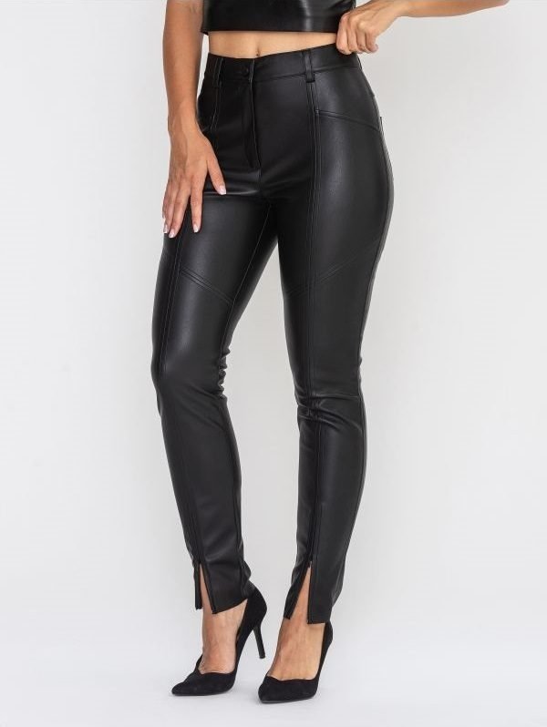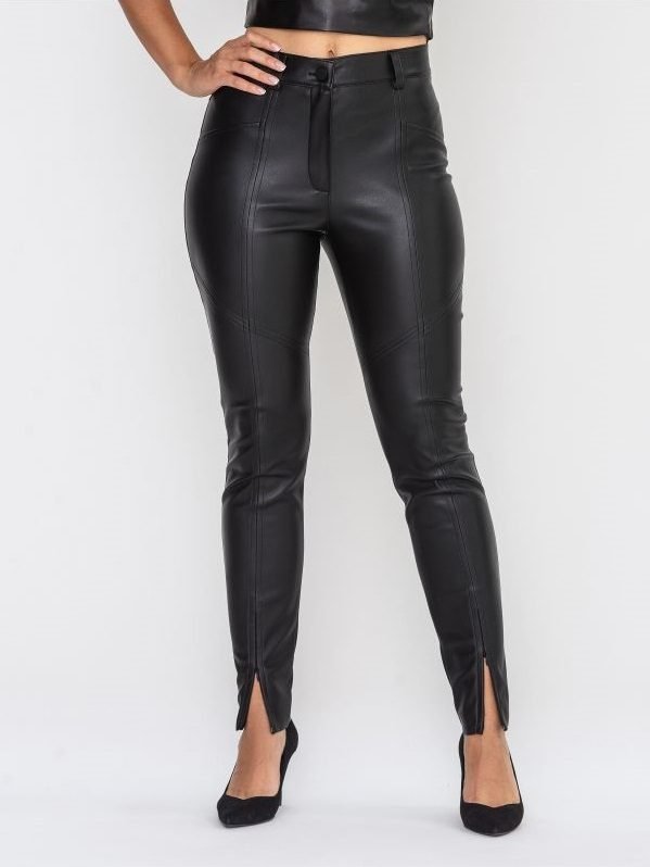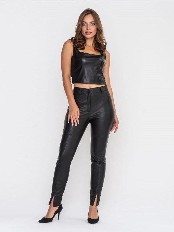 Стильні шкіряні штани високої посадки з розрізами спереду, які застібаються на потаємну блискавку. Декоративні рядки візуально подовжують ноги, надаючи їм стрункість. Ззаду-кокетка і накладні кишені. Застібаються на гудзик і блискавку.