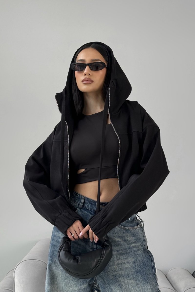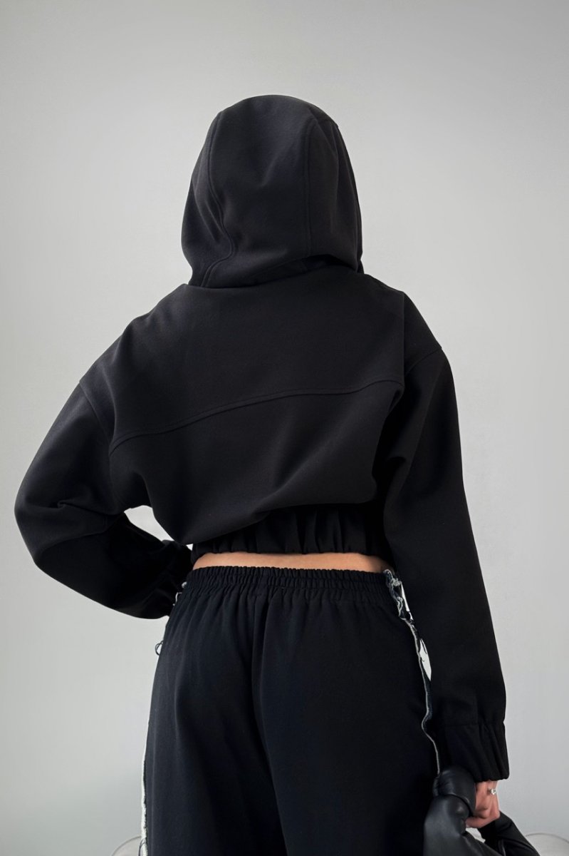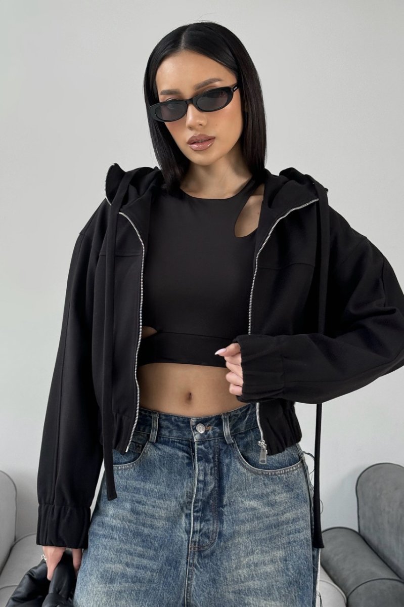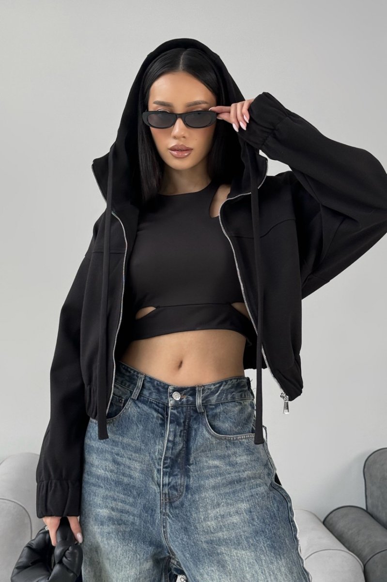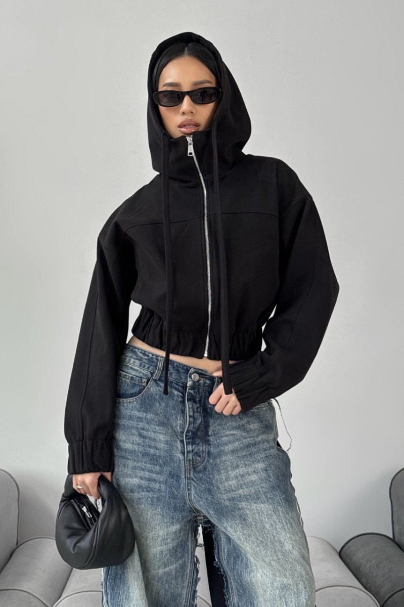 Укорочений куртка бомбер - основа сучасного стрітстайлу. Трендова модель бомберу з заниженою лінією плечей та капюшоном, який переходить у комір – стійку. По низу бомберу широка резинка. Доповнюють модель два зручних кармани по переду.