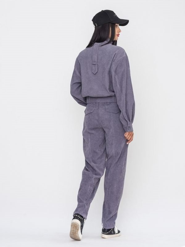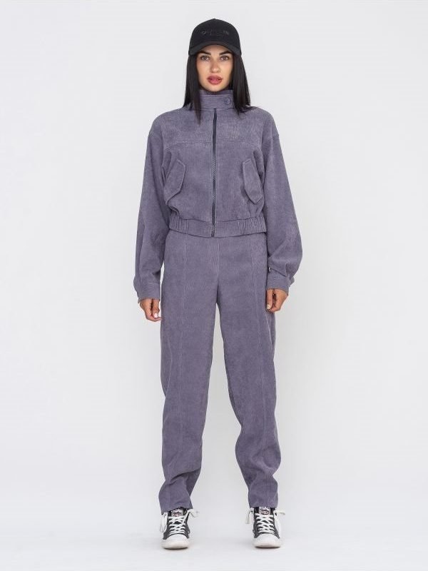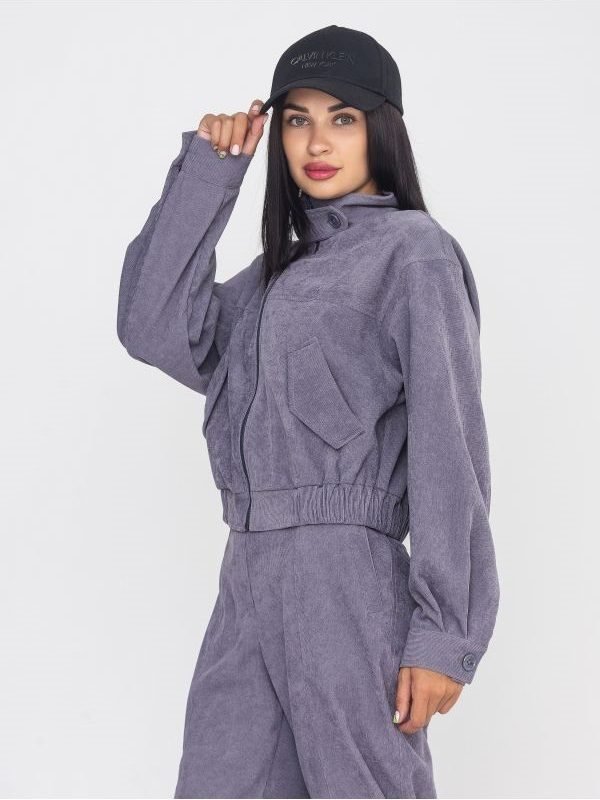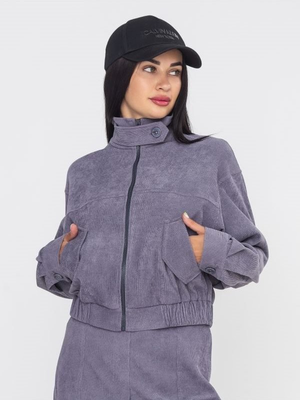 Куртка-бомбер вільного крою із застібкою на блискавку. Комір-стійка доповнений шлевкой і ґудзиком. З боків зручні косі кишені з клапанами. Ззаду декоративна шлевка. Широкий манжет по краю, з боків куртки вставки з гумки.
