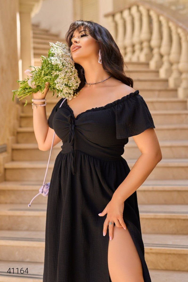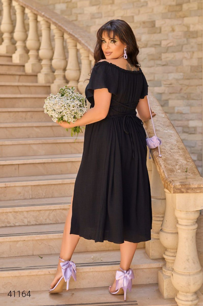 Літня однотонна сукня. Сукню можна моделювати: мотузочки, розташовані в районі грудей, можна зав'язати бантиком або зробити виріз декольте глибшим. Позаду шнурівка – регулює приталеність. Тканина: муслин жатка.