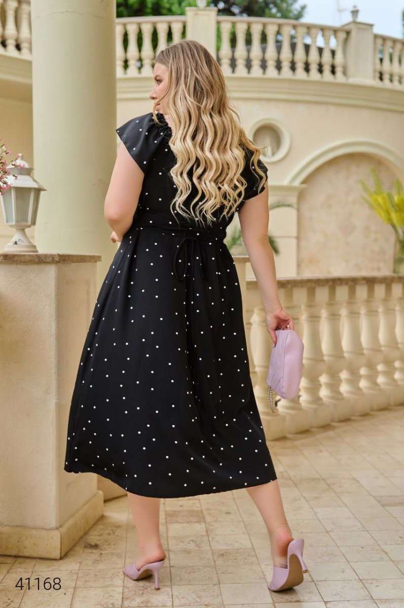Літня сукня в горошок. Сукню можна моделювати: мотузочки, розташовані в районі грудей, можна зав'язати бантиком або зробити виріз декольте глибшим. Позаду шнурівка – регулює приталеність. Тканина: софт-шовк (у складі віскоза та поліестер, приємна на дотик).