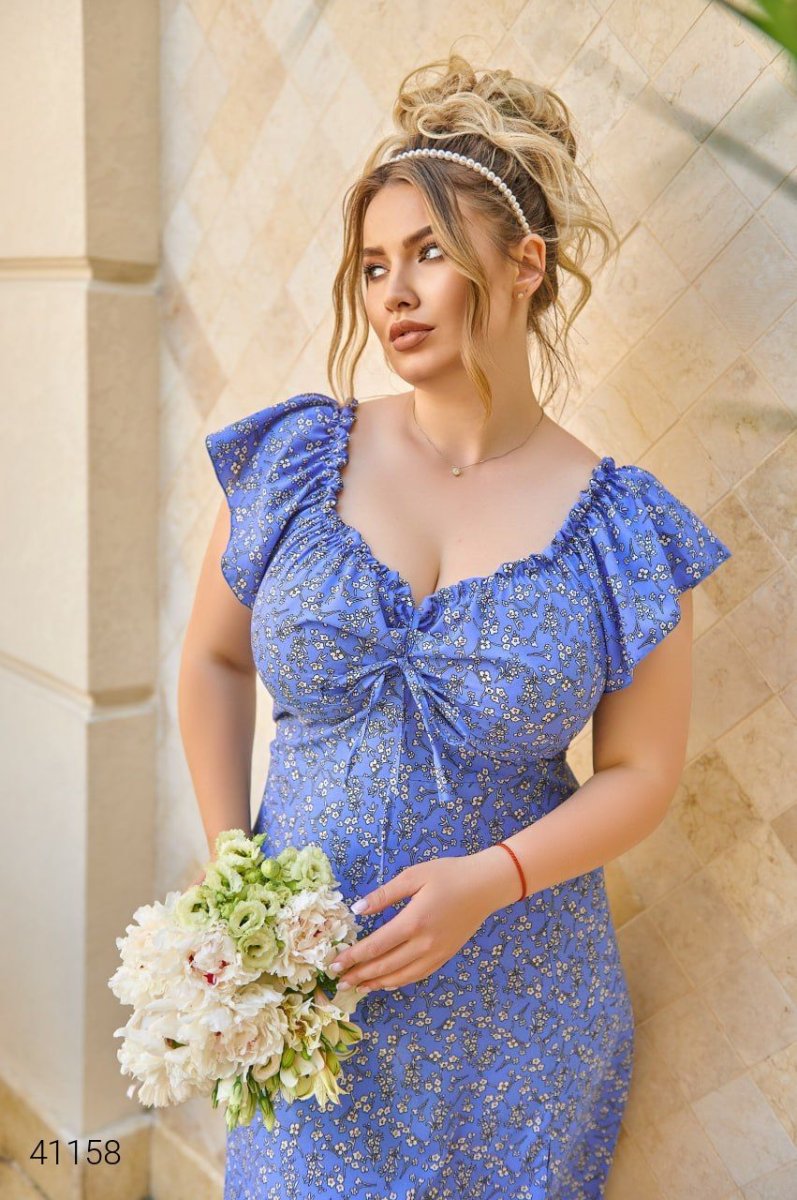 Літня сукня в квіточку. Сукню можна моделювати: мотузочки, розташовані в районі грудей, можна зав'язати бантиком або зробити виріз декольте глибшим. Позаду шнурівка – регулює приталеність. Тканина: софт-шовк (у складі віскоза та поліестер, приємна на дотик).