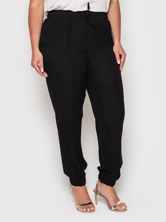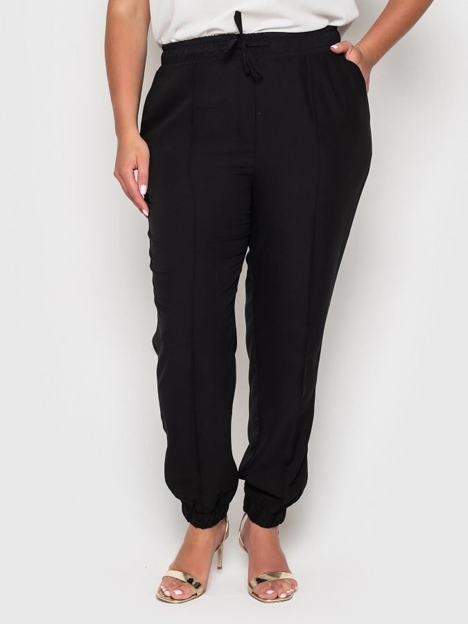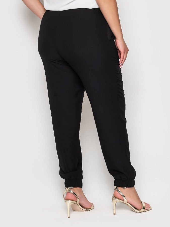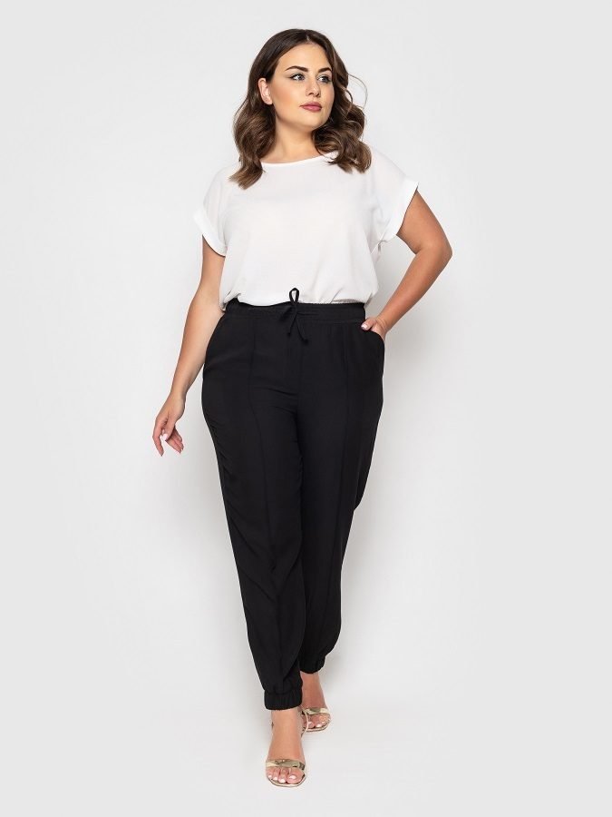 Невагомі штани вільного крою високої посадки. Пояс широкий, еластичний на зав'язках. Штани з відстроченими стрілками на еластичних манжетах. З боків косі кишені.