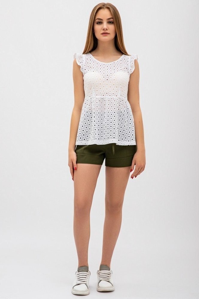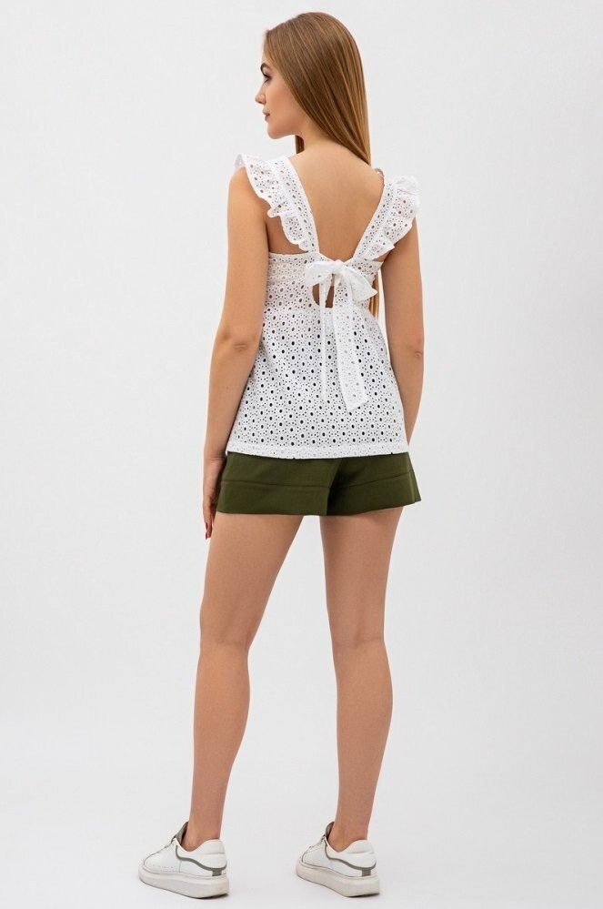 Літній топ з прошвы з ніжними оборками на бретелях і з зав'язками-бантом на спині.