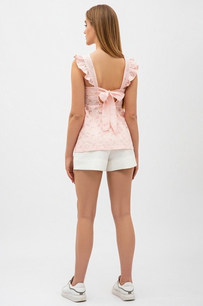 Літній топ з прошвы з ніжними оборками на бретелях і з зав'язками-бантом на спині.