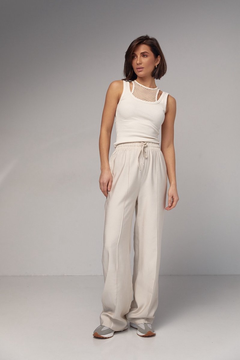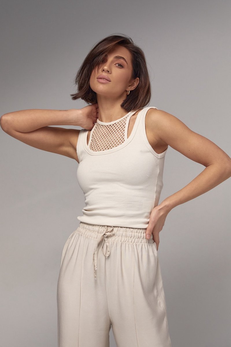Модель виконаний з трикотажу в дрібний рубчик з окантовкою на проймах та широкій горловині. Верху майка доповнена декоративною вставкою із блискучої сітки. Таке дизайнерське рішення перетворює звичайну майку на модну та трендову річ.