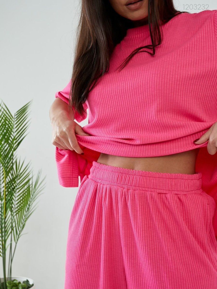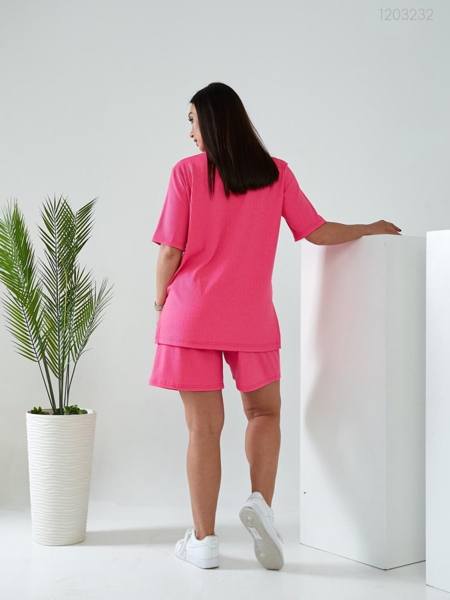 Деталі: кофта А-силует, з округлою горловиною та подовженою спинкою. Шорти-бермуди вільного крою з глибокими кишенями на бічних швах та поясом на широкій гумці