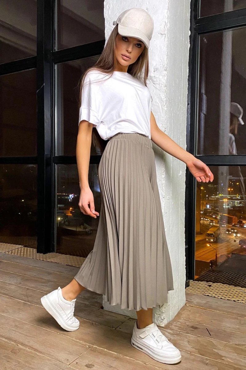 Однотонна спідниця пліссе в сірому кольорі. Ніжний матеріал приємний до тіла. Спідниця має прямий, розкльошений фасон. Ідеально поєднується з джемпером, футболкою, косухою та джинсуванням.