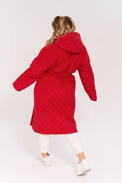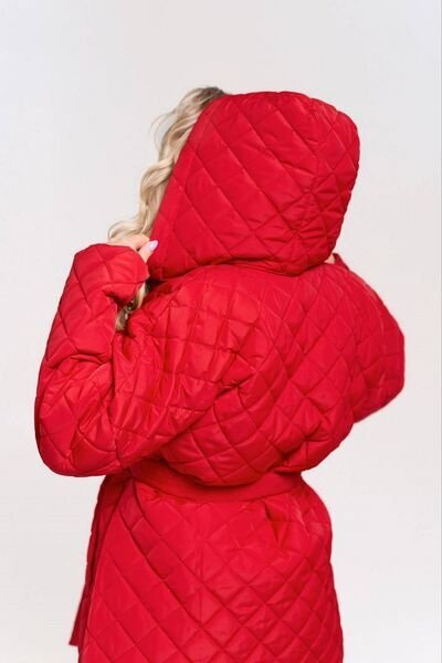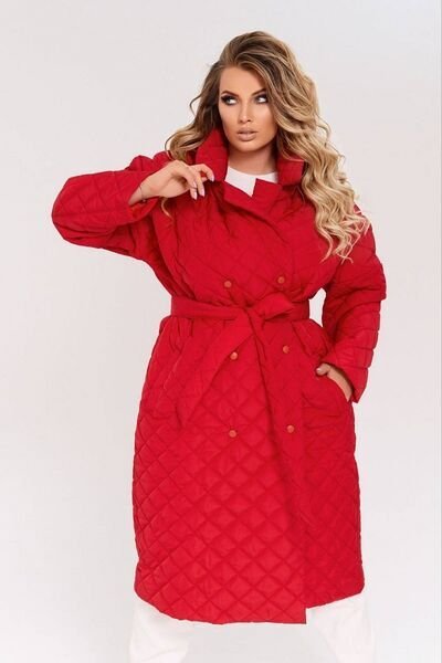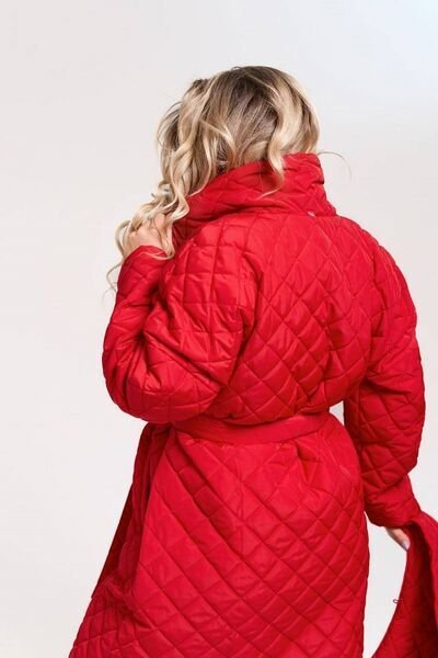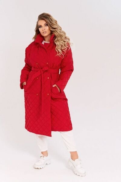 Довге стьобане пальто на силіконі. Вільного крою, лінія пройми занижена. Пальто двобортне, застібається на кнопки, бокові вшивні кишені. Пальто доповнено функціональним зручним капюшоном.
