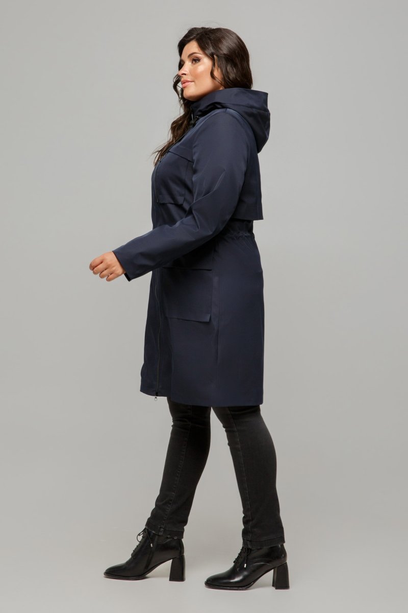 Плащ виконаний із плащівки макінтош без утеплювача. Досить щільна плащівка, причому досить м'яка. Вона практично не мнеться, не схильна до швидкого забруднення, добре тримає форму. Матеріал підкладки: нейлон. Капюшон виробу втачний, регулюється резинкою з фіксатором.