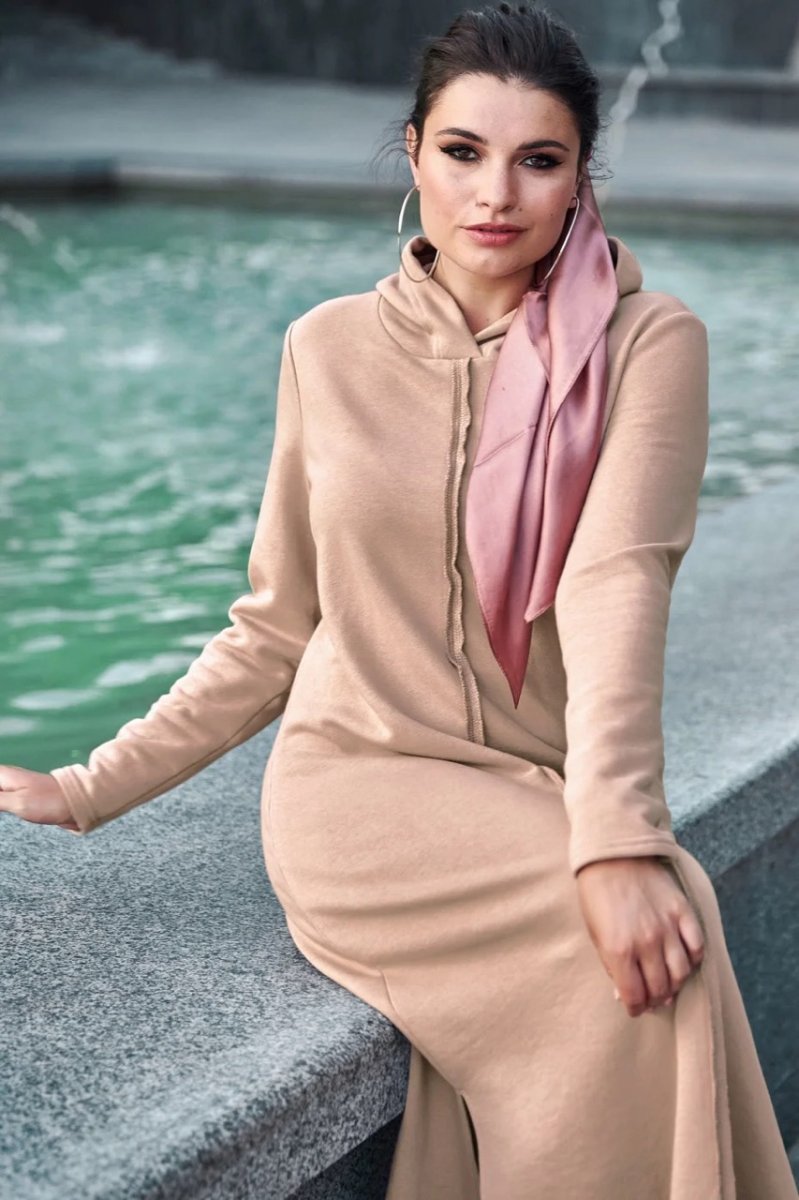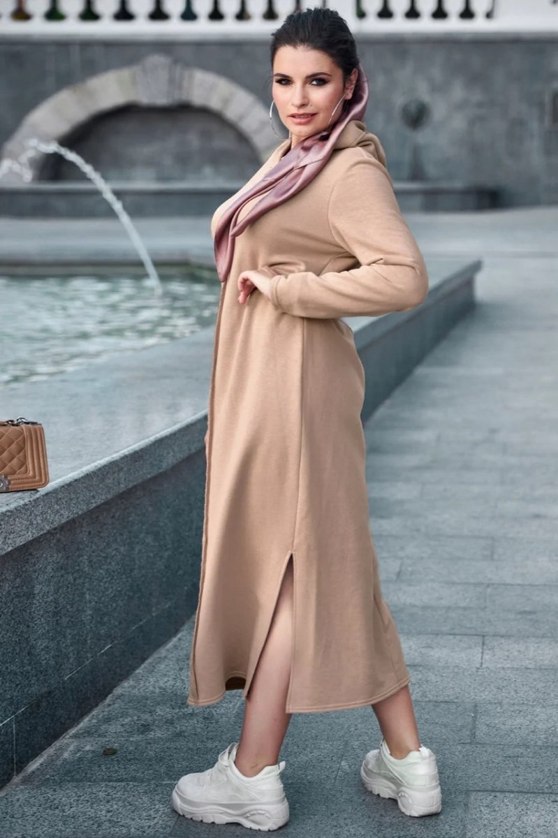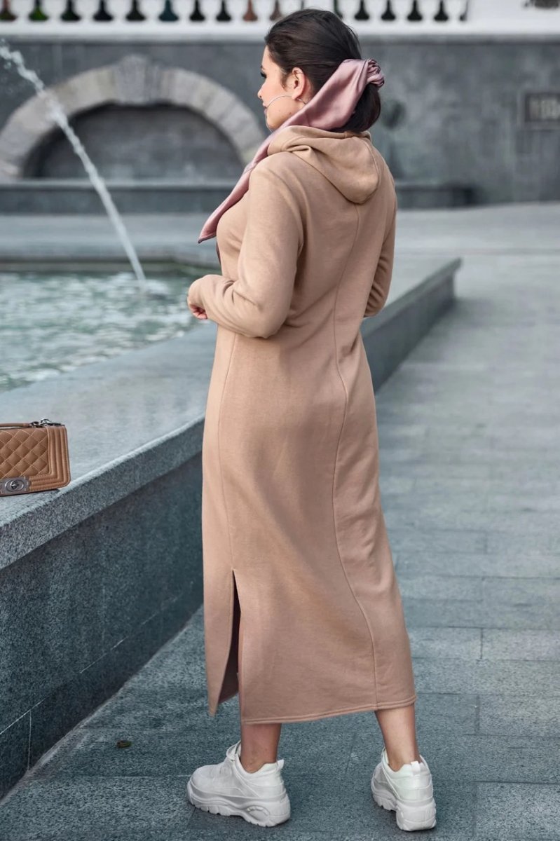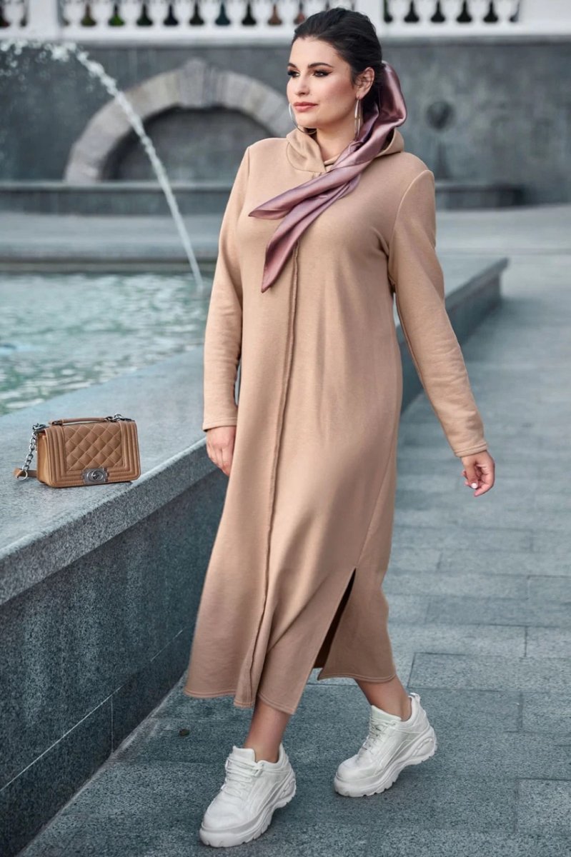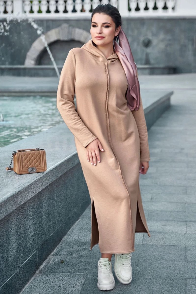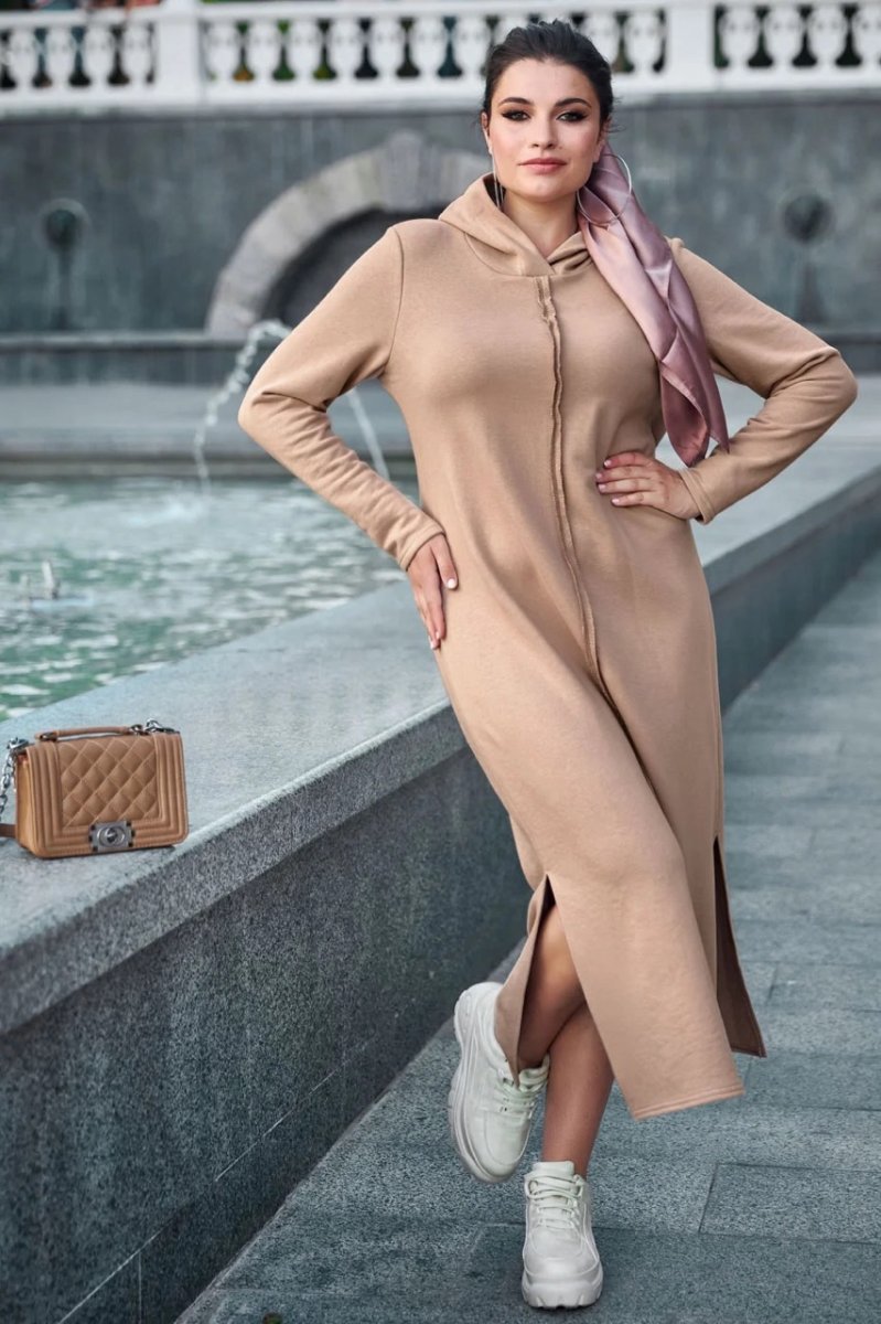 Сукня з колекції Goodbye summer plus size - стильне вбрання, яке підійде для спортивного чи повсякденного образу. Вільний напівприталений фасон не обмежує рухів, але в той же час робить вигідний акцент на перевагах фігури. Незвичайний декоративний прийом – оригінальні шви, що знаходяться на лицьовій стороні виробу. Довга сукня доповнює капюшон та бічні розрізи в нижній частині.