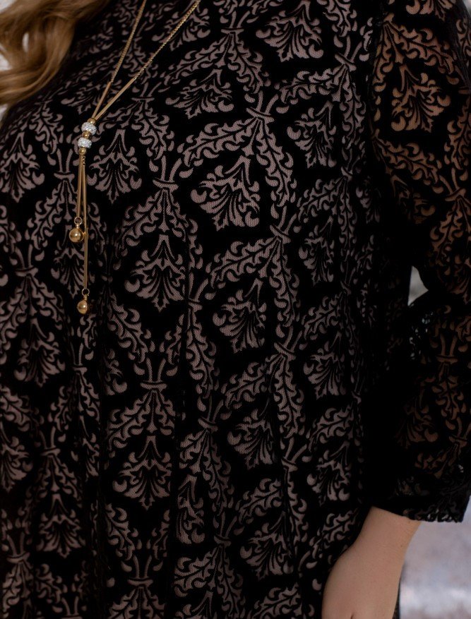Довгі рукава з невеликим манжетом дають сукні легкості та вишуканості. Їхня простота підкреслює красу рухів, створюючи вишуканий акцент на невеликому манжеті. Виріб складається з двох частин, які гармонійно доповнюють одну одну. Нижня частина сукні представлена трикотажною підкладкою, яка забезпечує відчуття комфорту і ніжності. Верхній шар виконаний з флоку, надаючи сукні теплоти та м'якості.