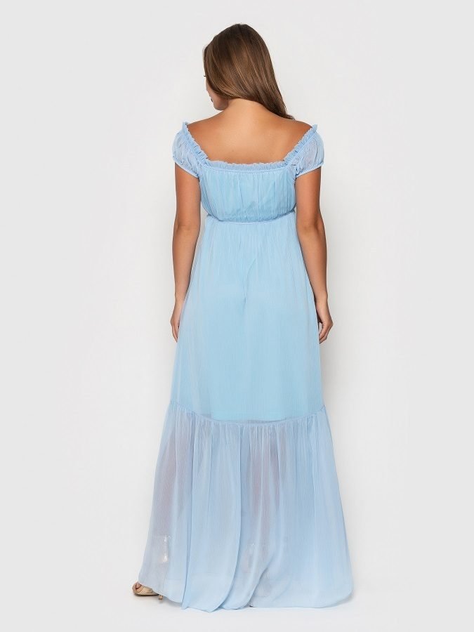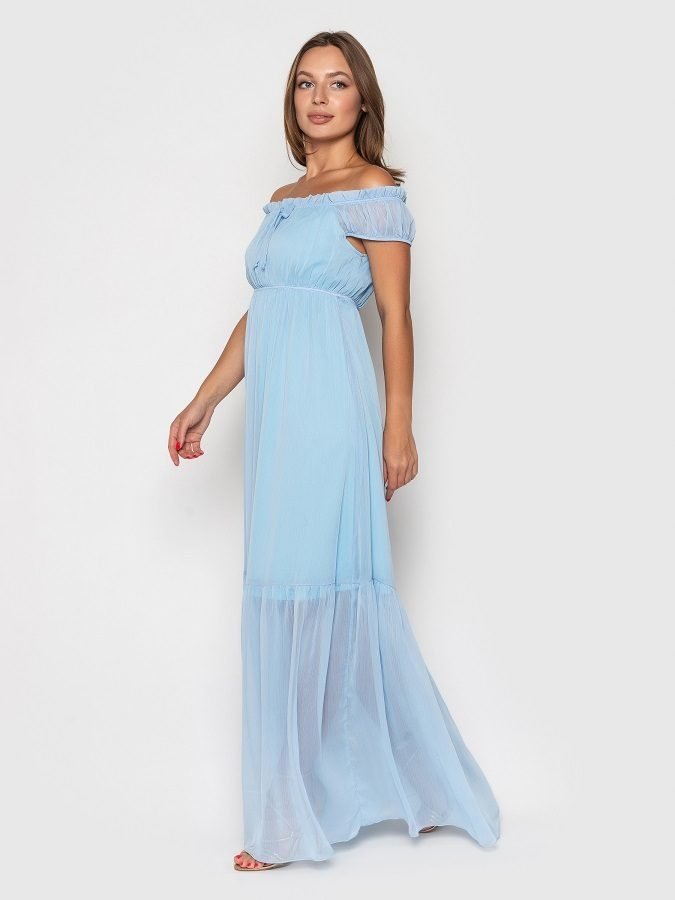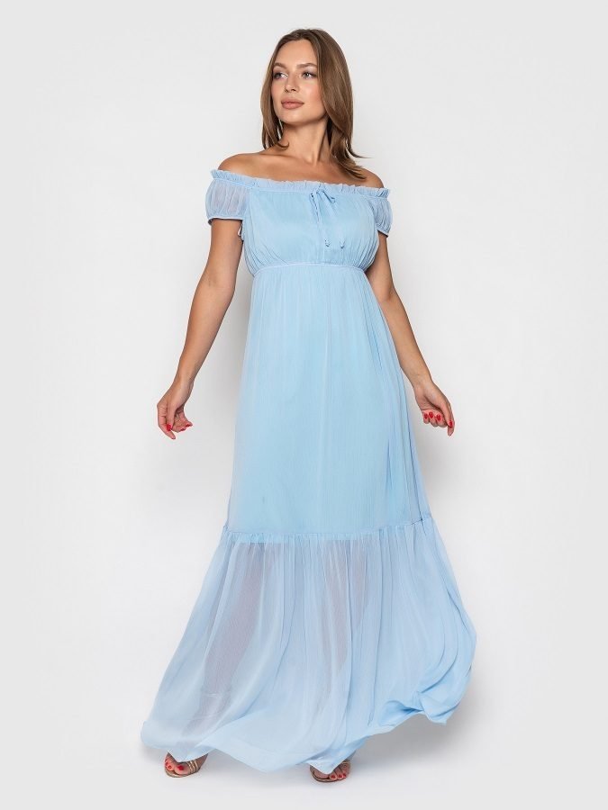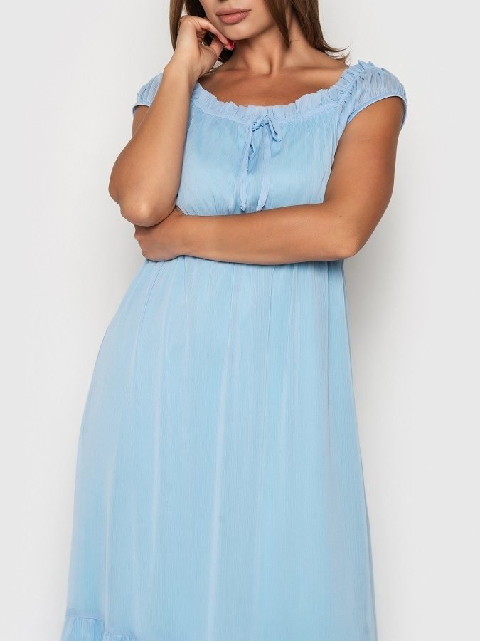 Романтичне плаття в стилі ампір з креш-шифону на трикотажній підкладці. Еластична вставка під грудьми. Горловина оформлена еластичною вставкою і рюшів, є декоративні зав'язки по переду. Спідниця з широким воланом.