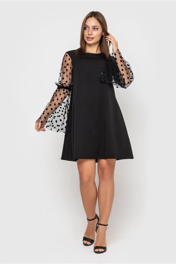 Вільне коктейльне плаття Алісія з об'ємними розкльошені рукавами з флокірованной сітки в горошок. Рукава доповнені декором у вигляді велюрових стрічок і сітки. Застібка-потайна блискавка по центру спинки.
