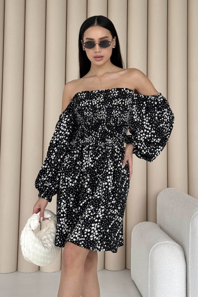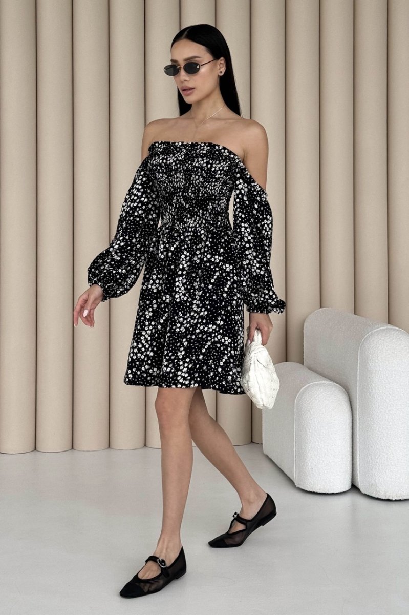 Оригінальна літня міні- сукня. Відкриті плечі та ефектний довгий рукав-ліхтарик. Шикарну розкльошену юбку, доповнює еластичний ліф. Міні-сукня із завищеною талією, еластичним ліфом і відкритою лінією плечей, буде особливо актуально в спекотні дні.