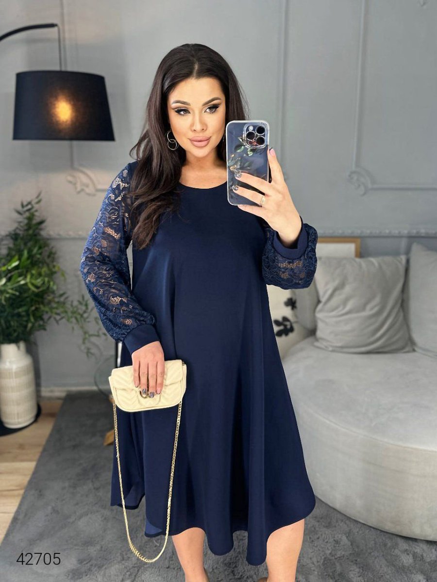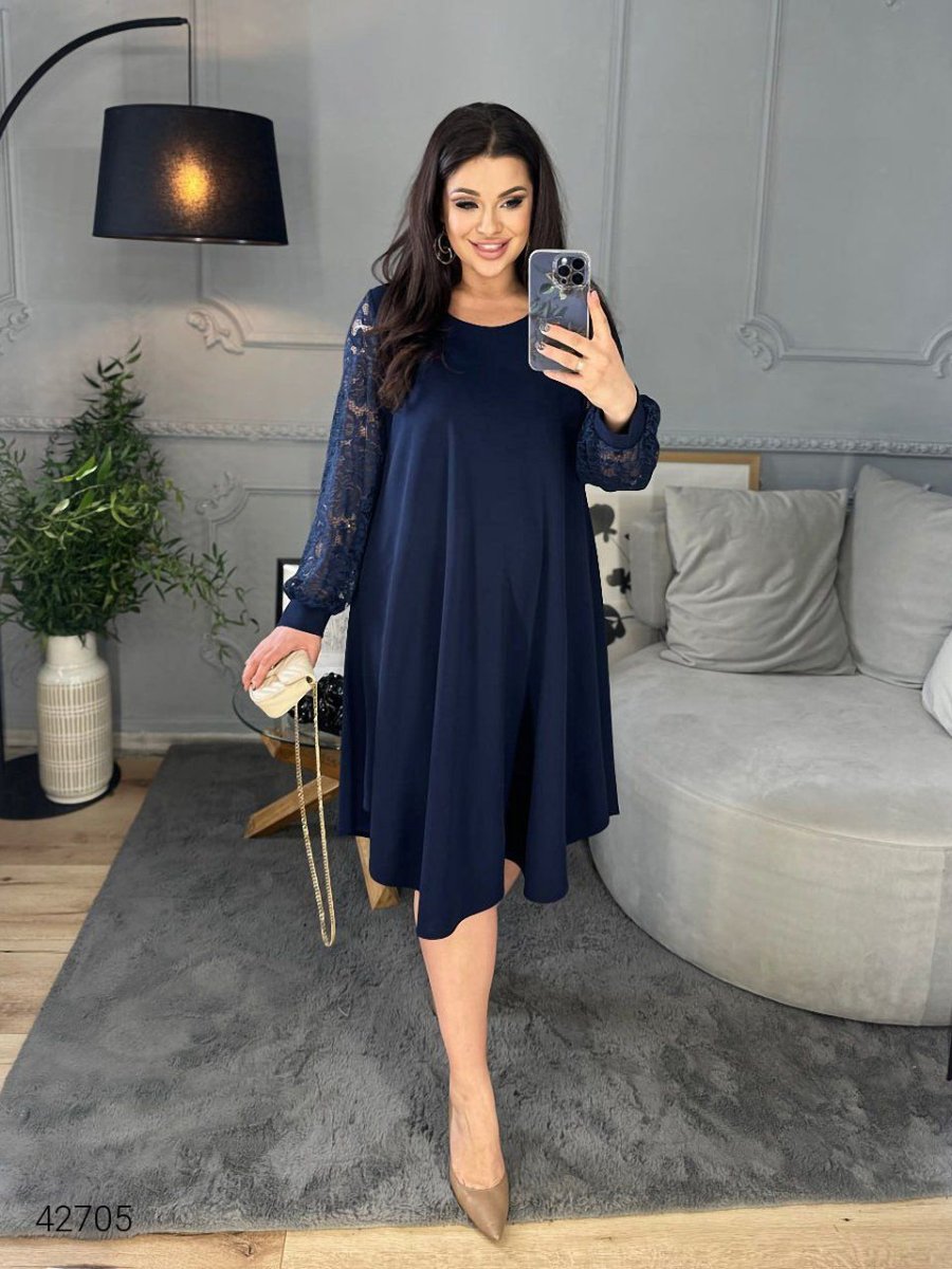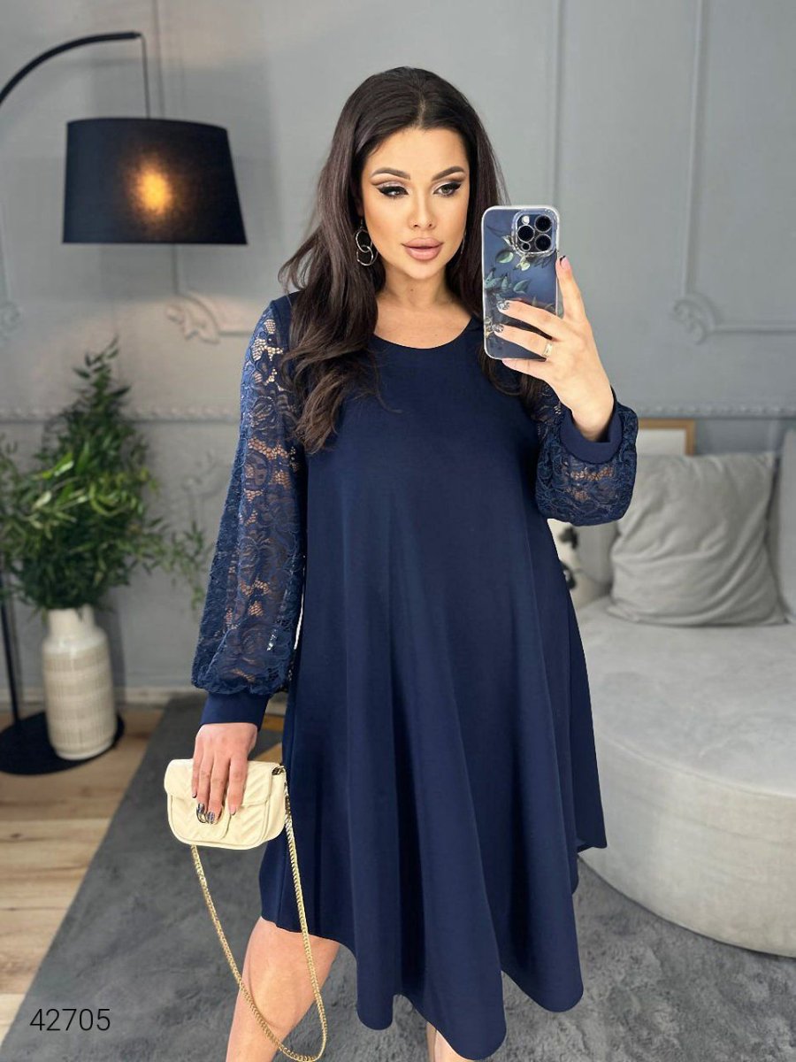 Сукня з рукавами з гіпюру. Силует сукні у вигляді трапеції, виріз горловини круглий. Рукави на манжетах, виконані із  гіпюру в тон основної тканини. Низ сукні асиметричний.