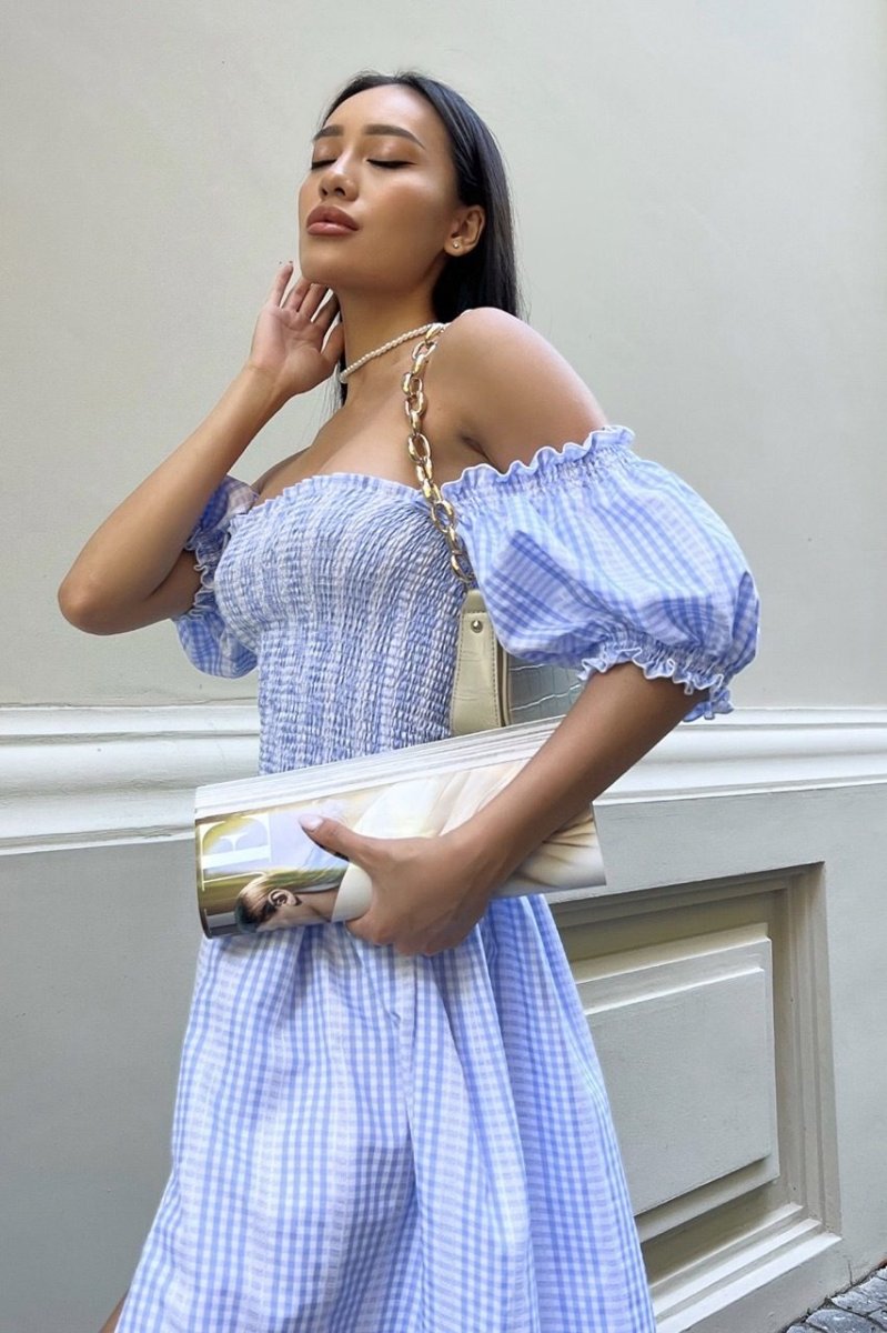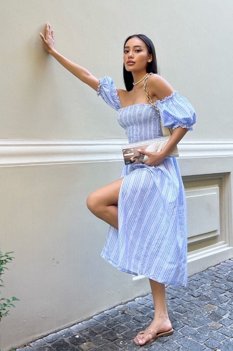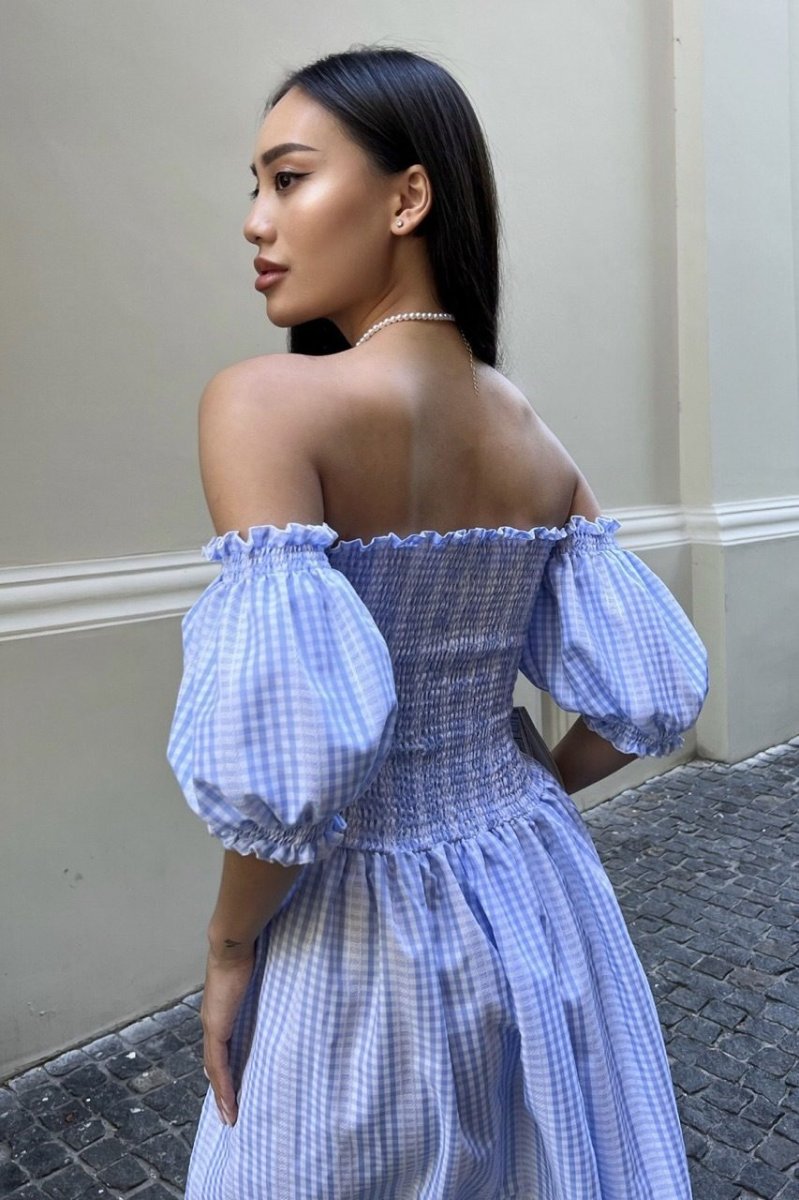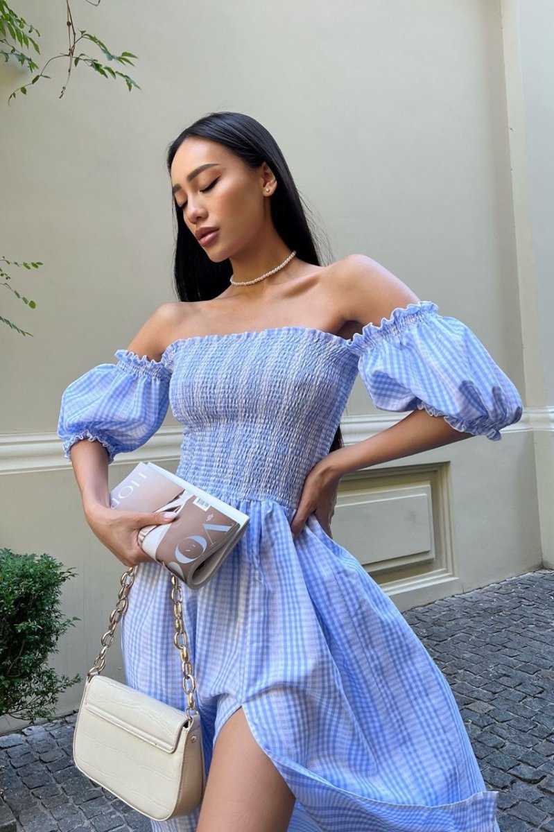Оригінальна літня сукня з повітряної тканини у клітинку. Відкриті плечі та ефектний довгий рукав-ліхтарик. Шикарну розкльошену юбка з високим розрізом, доповнює еластичний ліф.