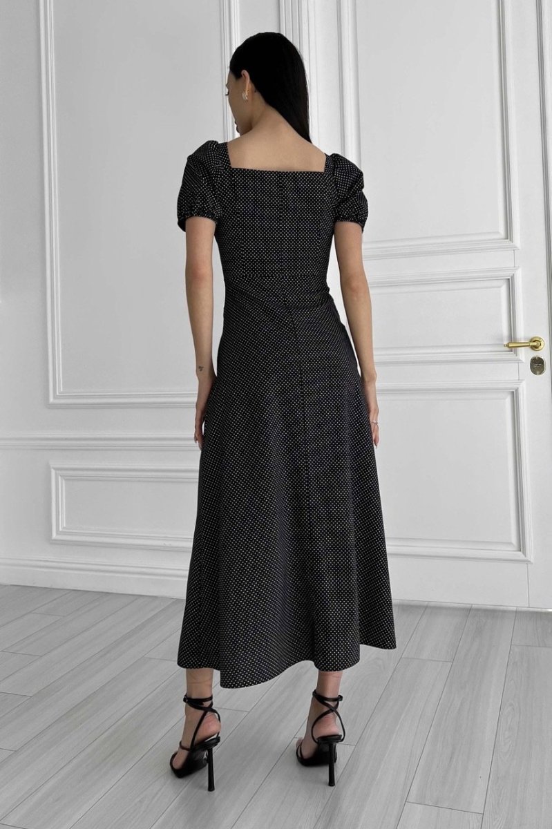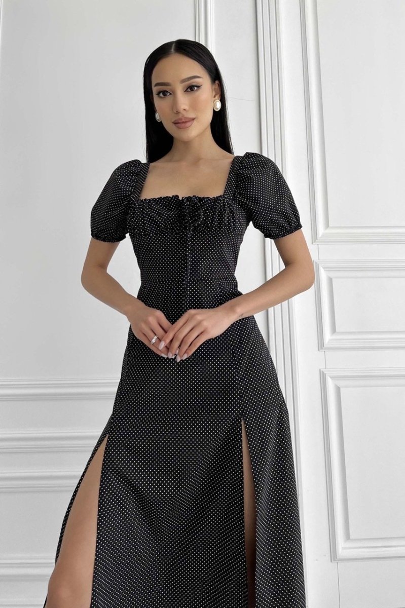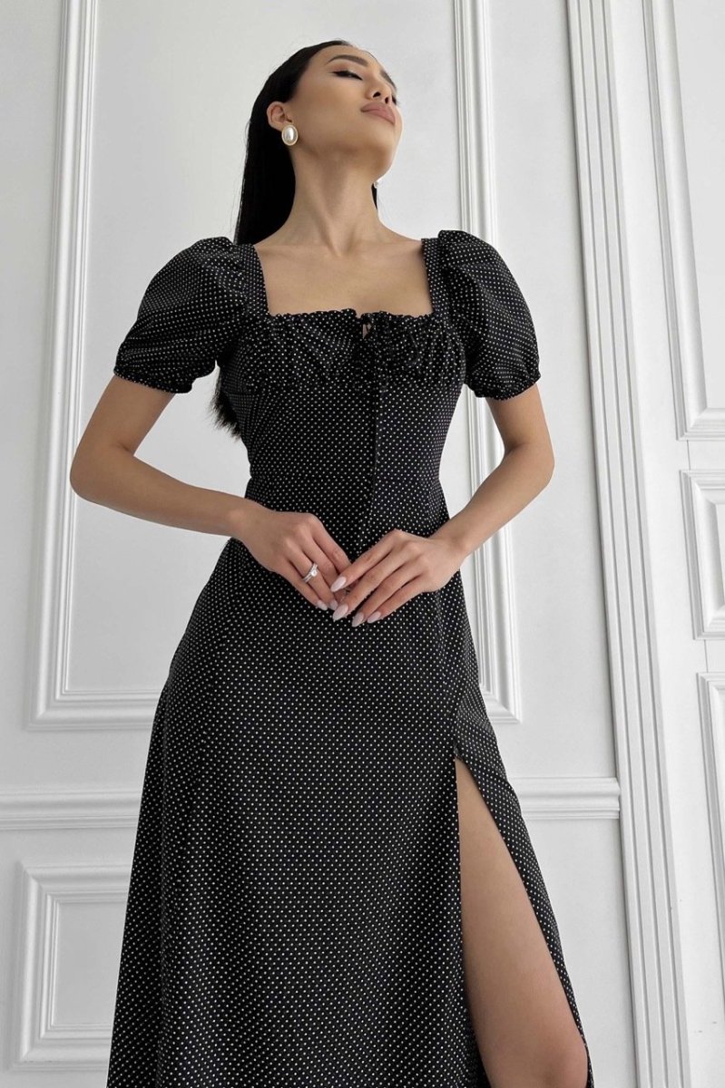 Літня сукня-міді романтичного крою. Виконано з принтованої тканини (горошок), що струмує. Модель прикрашає фігурний виріз та драпіровка по ліфу, що підкреслює зону декольте. Короткий рукав-ліхтарик із еластичною манжетою. Довга спідниця а-силуету підкреслює лінію талії. На спідниці передбачено два розрізи.