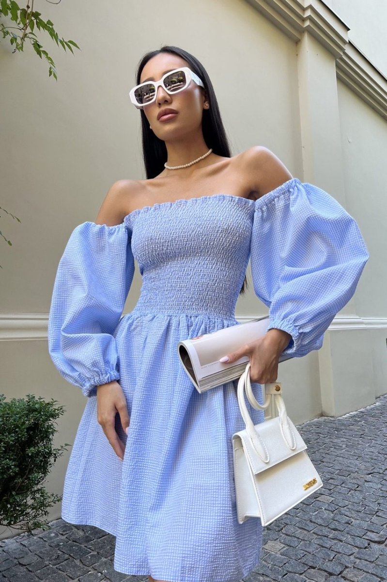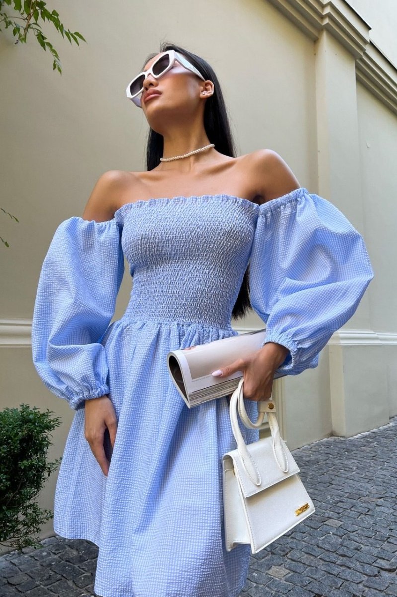 Міні-сукня із завищеною талією, еластичним ліфом і відкритою лінією плечей, буде особливо актуально в жаркі дні. Легка однотонна модель з рукавами-ліхтариками, зшита з дихаючого тонкого матеріалу виконано в яскравій палітрі літніх кольорів.