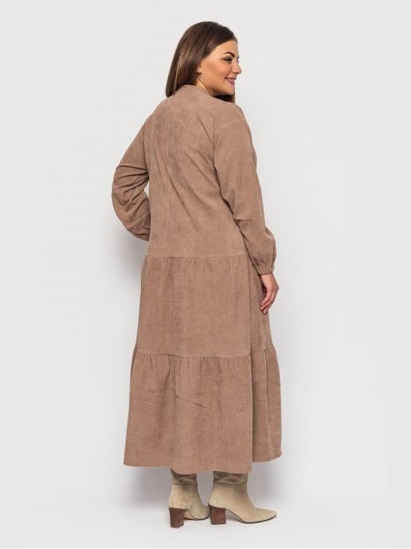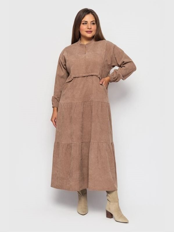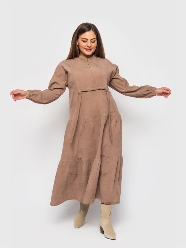 Елегантне плаття вільного крою зі спущеною лінією плеча. Застібається в області декольте на потаємну блискавку. Спідниця-каскад виглядає ефектно і додає образу жіночність. Під грудьми куліса, від якої йдуть глибокі кишені. Манжети рукавів зібрані на гумку.