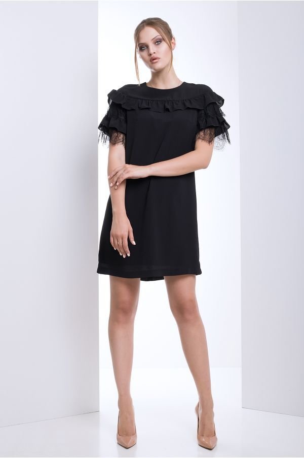 Елегантне плаття Каліфорнія допоможе вам у створенні ефектного і образу, що є ятовується! Модель має злегка прилеглим силуетом. Прикрашає виріб легка рюшу спереду і на спинці. Оригінальним рішенням є рукави сукні, виконані з комбінації шарів гіпюру і основного матеріалу. Передбачена легка трикотажна підкладка з гладкою текстурою. Застібається сукню на потаємну блискавку по спинці.