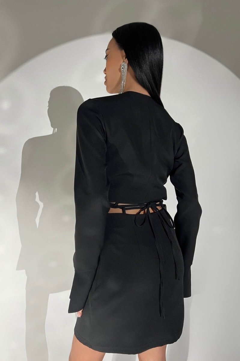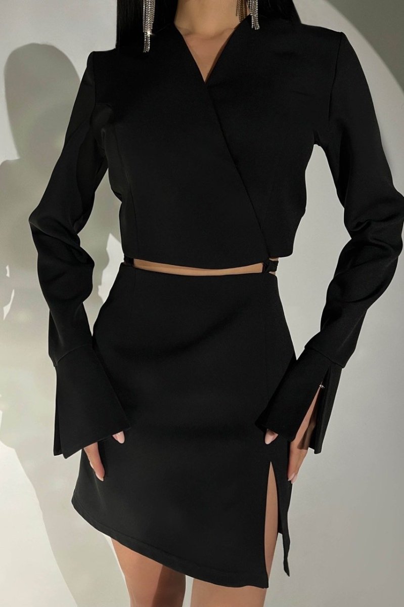 Незвичайна та цікава модель сукні-костюму. Ліф на запах та коротка спідниця з розрізом з’єднуються між собою з допомогою шнурівки. На спідниці позаду - потаємна блискавка. На спідниці та на ліфі зроблені петельки, у які протягується шнурівка. Довершує образ довгий рукав з широким манжетом.