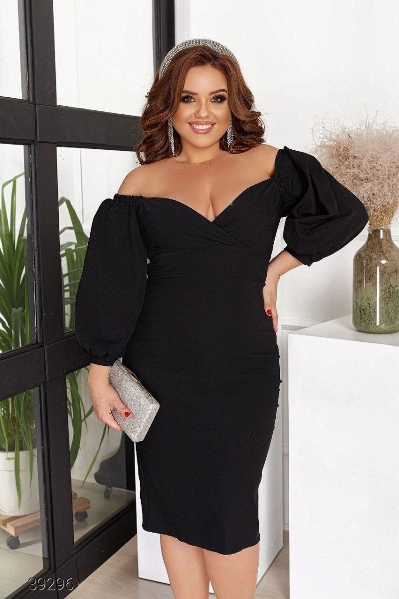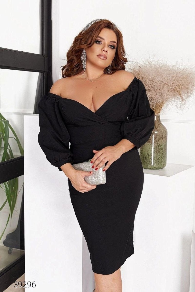 Сукня коктейльна великих розмірів. Глибокий виріз серцем, об'ємні рукави зверху. Позаду шліця та застібка на потайну блискавку. У плечах і рукавах гумка, що дозволяє носити сукню як із відкритими, і із закритими плечима. Тканина: джинс-бенгалін.