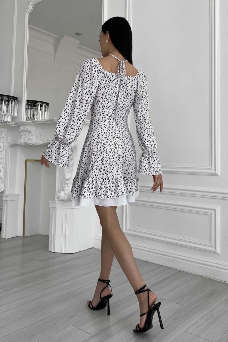 Ніжна сукня з легкої тканини у весняно-літній принт, оздоблена грайливими воланами по спідниці та ліфу. Модель представлена у широкій кольоровій гамі, довжина міні. Сукня приталеного крою з довгими рукавами з еластичними вставками. Легкий софт надає образу грайливість та романтичність. Квітковий принт залишається актуальним поза сезоном. Застібається на блискавку по спинці.