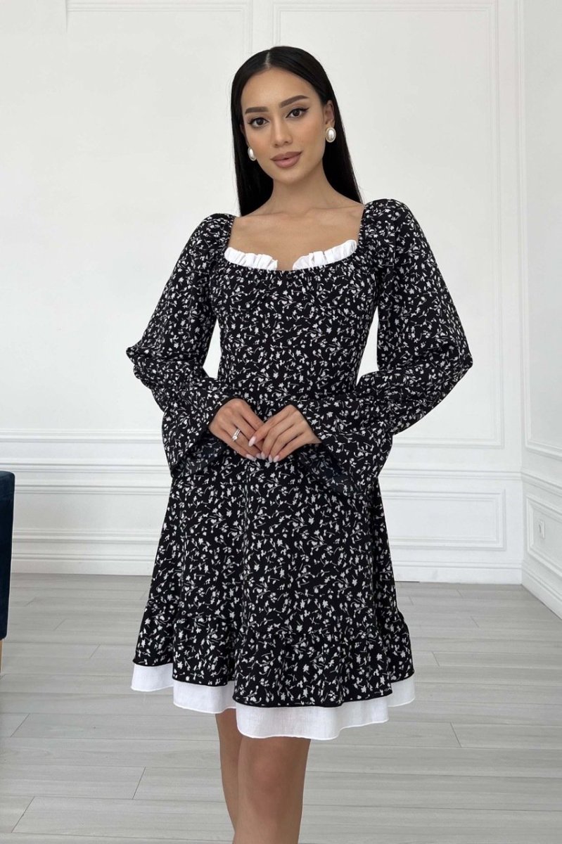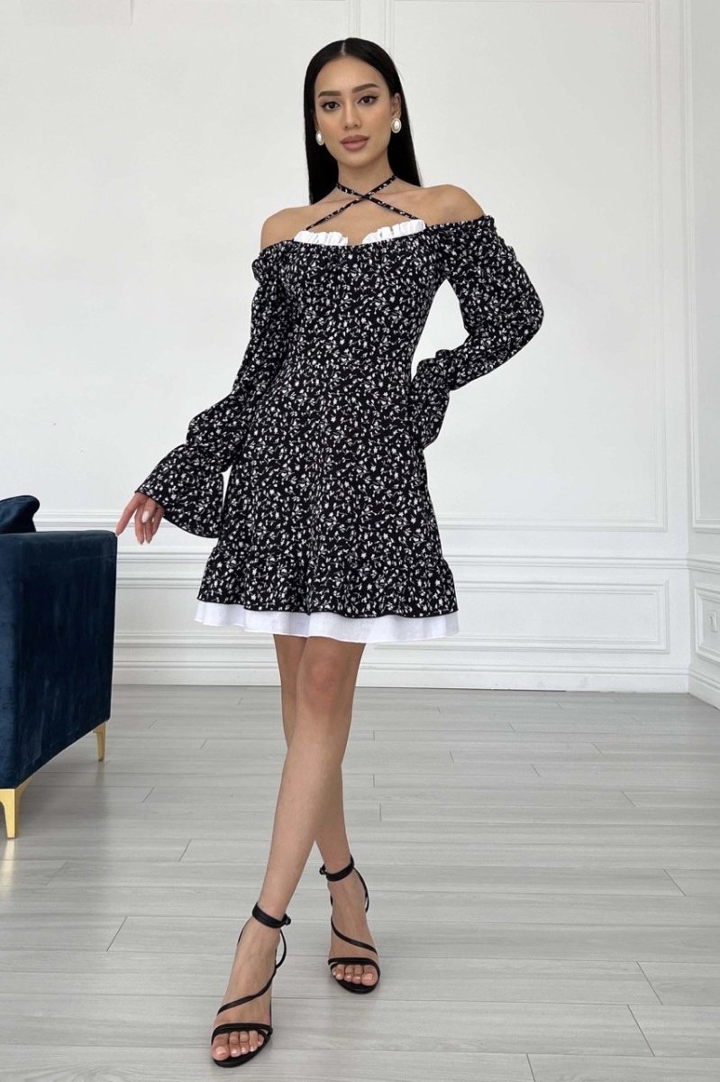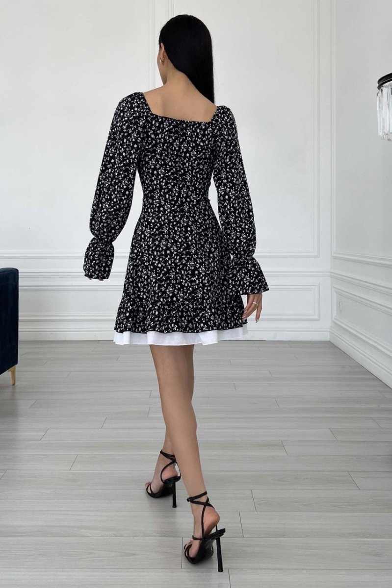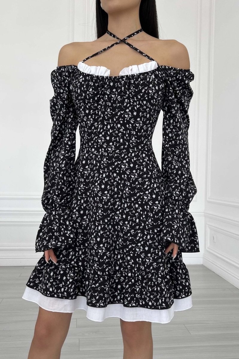Ніжна сукня з легкої тканини у весняно-літній принт, оздоблена грайливими воланами по спідниці та ліфу. Модель представлена у широкій кольоровій гамі, довжина міні. Сукня приталеного крою з довгими рукавами з еластичними вставками. Легкий софт надає образу грайливість та романтичність. Квітковий принт залишається актуальним поза сезоном. Застібається на блискавку по спинці.